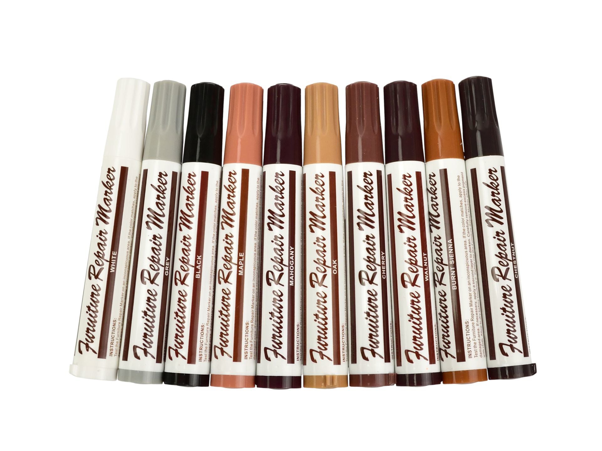 Setul va permite sa mascati fisurile, sparturile etc. intr-un mod estetic si ieftin.Setul include 10 culori de markere si 10 creioane de ceara in aceleasi culori . Repararea suprafetei deteriorate se efectueaza in doua etape, mai intai, umpleti defectul cu un creion de ceara semi-dur intr-o culoare selectata corespunzator, apoi acoperiti acest loc cu markere de ulei pentru a crea o structura asemanatoare lemnului.