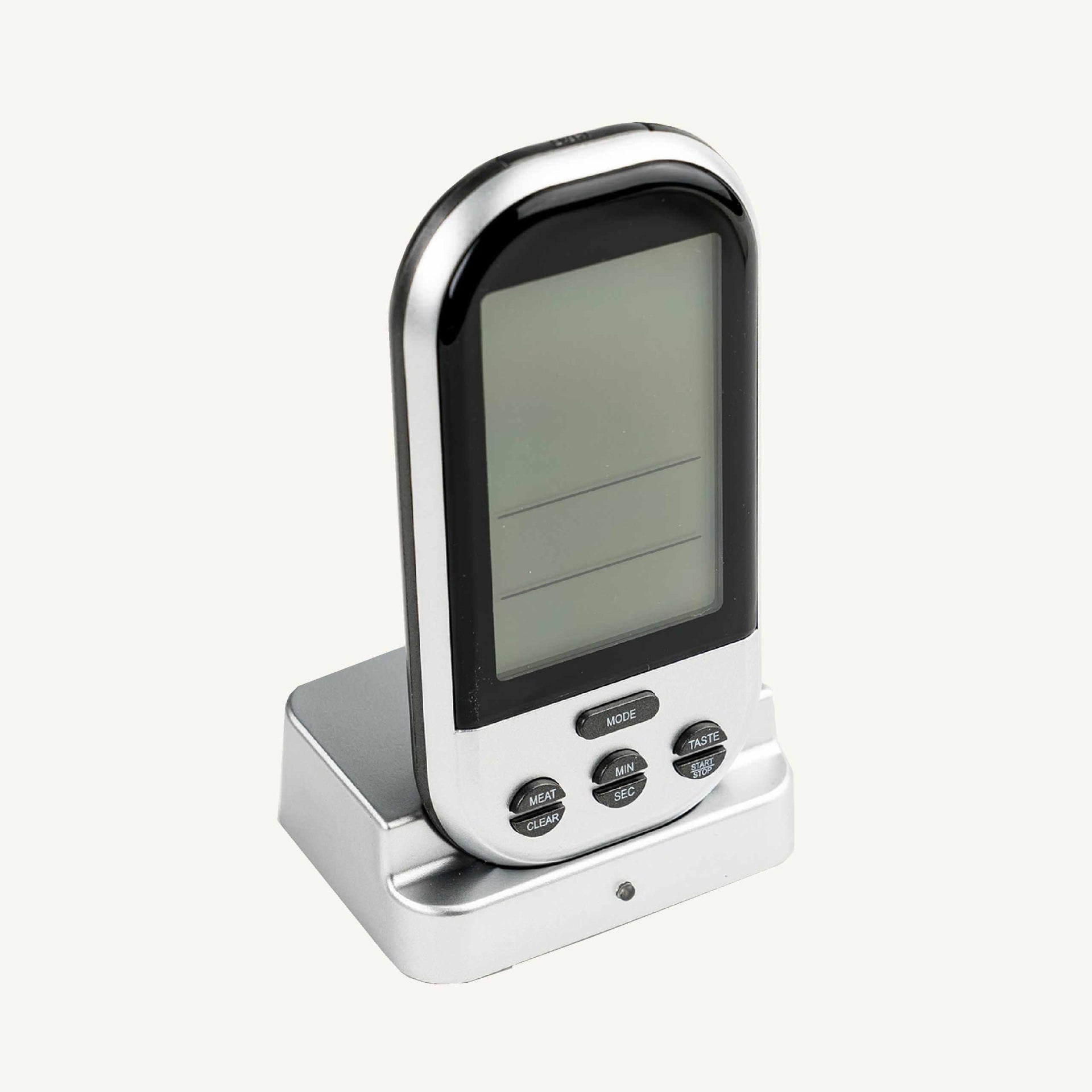 Termometru electronic elegant de bucatarie pe un suport cu o sonda alimentara. Va facilita prepararea mancarurilor intr-un afumator si pe gratar. Va indica temperatura de la 0 la 250 ° C. Termometrul este foarte usor de utilizat. Indispensabil in prepararea carnurilor, in special a fripturii cu diferite grade de preparare. Termometrul este fabricat din materiale rezistente si este usor de curatat. Cand un anumit produs atinge temperatura indicata, termometrul da o alarma.