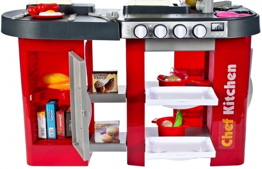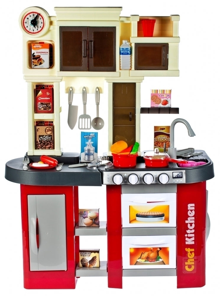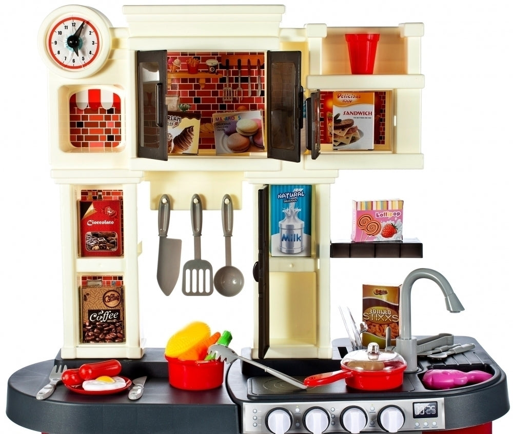Bucataria contine o multime de rafturi, dulapuri si alte astfel de locuri în care toata lumea poate aranja voluntar elementele incluse în set. Atingerea din dreapta functionează ca si adevaratul lucru! Pompeaza apa, astfel încat copilul sa poata imita parintii în activitatile de zi cu zi.