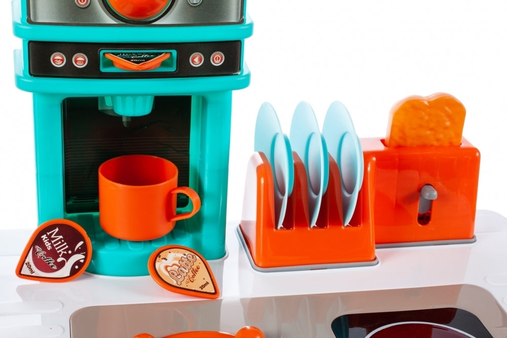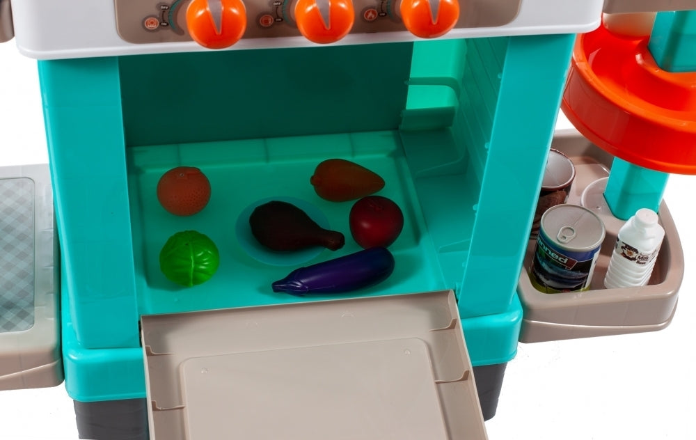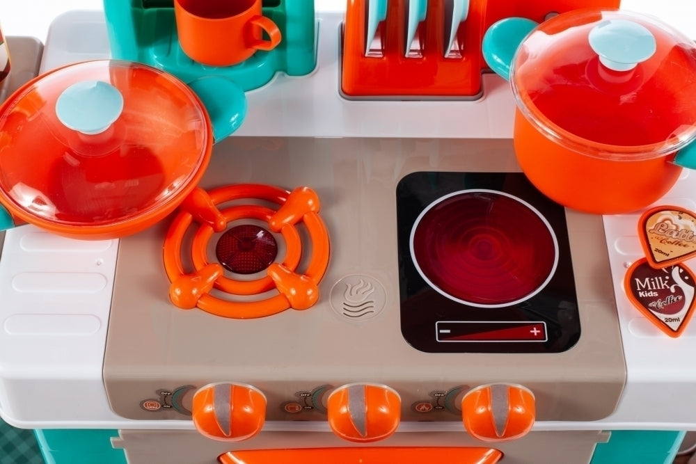 Aragazul dezvolta imaginatia copilului tau, oferindu-i în acelasi timp multa distractie. Copilul dvs. se poate simti ca un adevarat bucatar, gatind felurile de mancare care le plac. Setul include o multime de elemente care nu numai ca vor multumi copilul mic, ci si vor dezvolta abilitatile sale manuale. Bucataria noastra este un element inseparabil al echipamentului fiecarui tanar bucatar. Copiii vor gasi o soba cu arzator pe gaz si un arzator cu inductie. Robinetele pentru controlul aragazului sunt amplasate pe blatul superior. Prin rotirea primului buton, arzătorul de gaz pornește și scoate un sunet de gătit. După întoarcerea celui de-al doilea, cuptorul porneste si ne anunta cand mancarea este gata. Al treilea buton porneste arzatorul cu inductie, puterea acestuia putand fi redusa sau marita cu ajutorul panoului tactil. Exista o chiuveta langa cuptor.