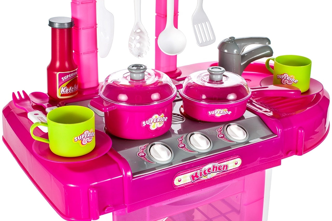 Bucătăria scoate un sunet când se joacă și luminile din arzătoare sunt aprinse. Bucătăria are două arzătoare (2 baterii AA), o tavă laterală suplimentară, un raft deschis, o chiuvetă.