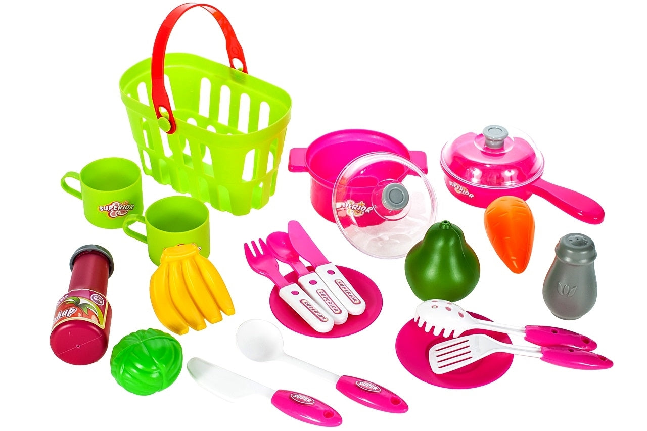 Setul mai include: oale cu capace, tacâmuri, căni, ustensile de bucătărie, căni și condimente și, în plus, un coș cu fructe! Întreaga bucătărie poate fi pliată într-o valiză convenabilă!