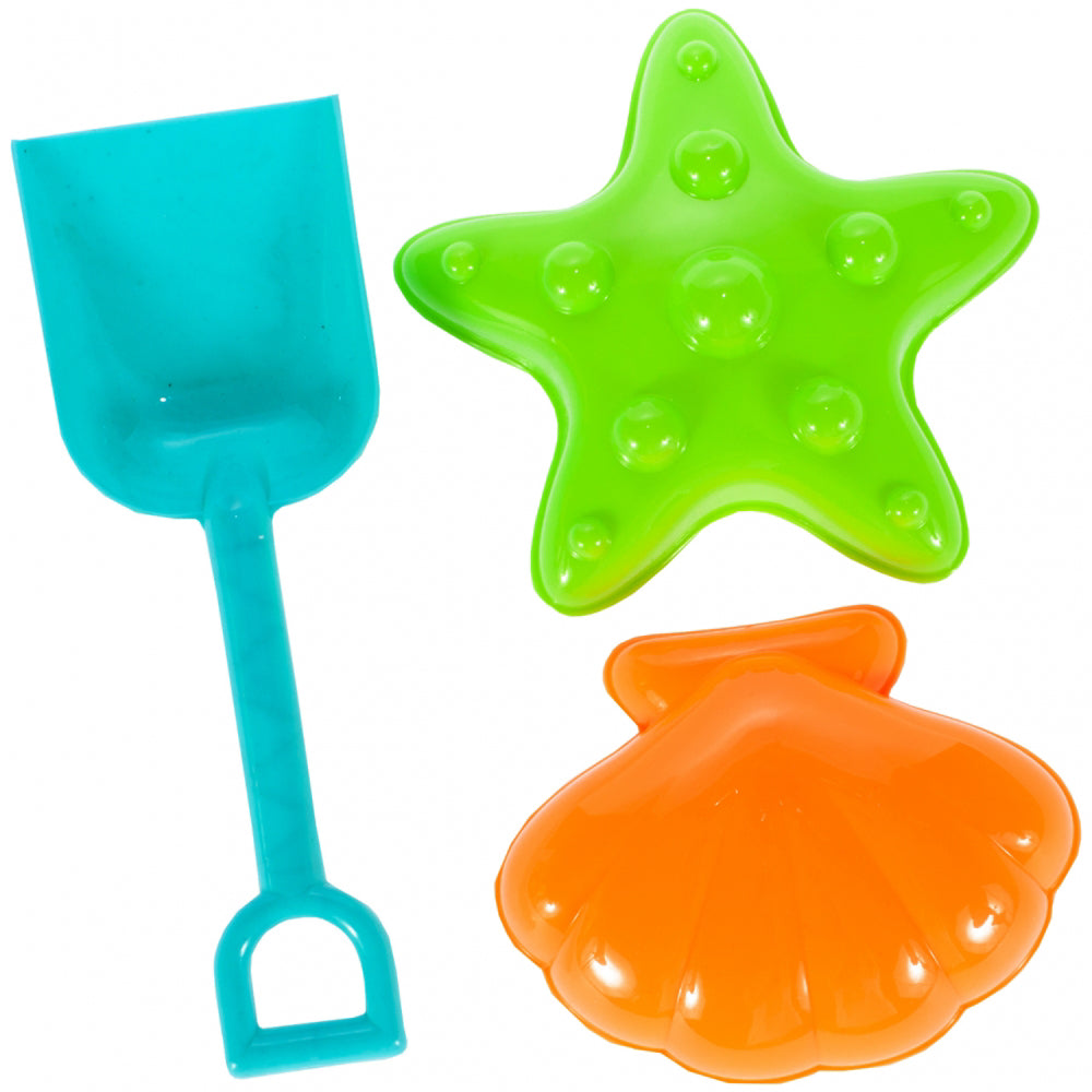 Setul include: un buldozer cu spatula si doua matrite (o stea de mare si o scoica).