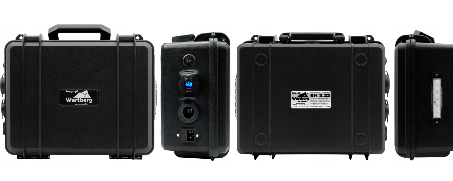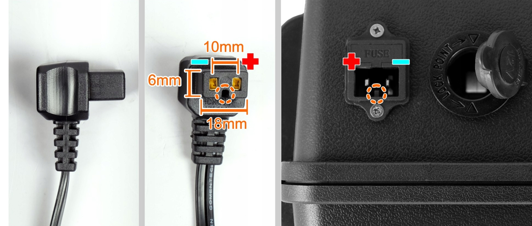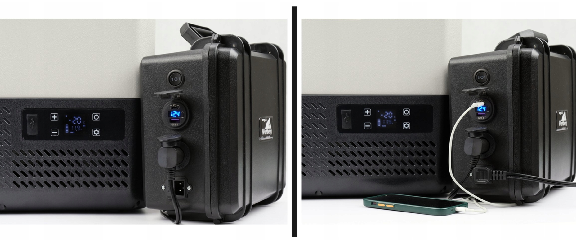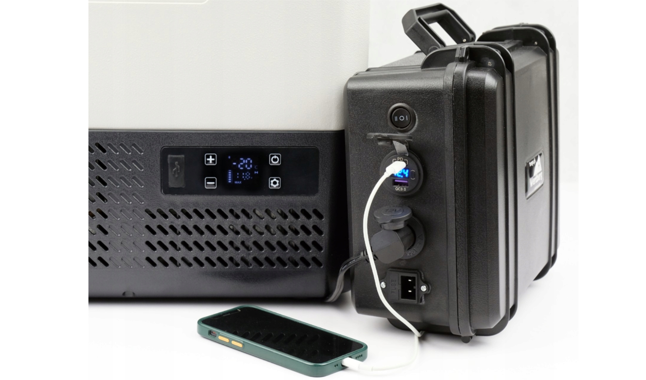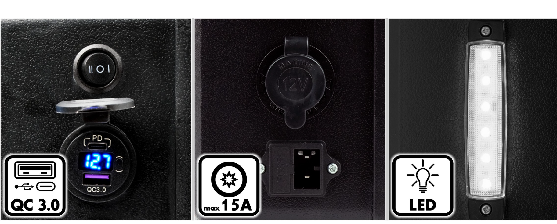 - Priza de tip IEC C12 cu o siguranta de 15A - alimentare / incarcare cu o sursa de alimentare cu o mufa C11 (inclusiv: o sursa de alimentare din echipamentul standard al multor modele populare de frigidere cu compresor turistic ) 14,5 V | 4A - 6A | 60 W - 90 W