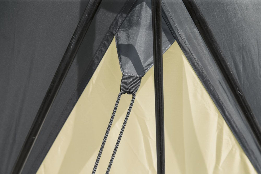 Un cort pliant este solutia perfecta pentru zilele caniculare. Compatibil cu toate spa-urile si piscinele gonflabile cu diametrul de pana la 3,66 m, ofera intimitate si protejeaza impotriva ploii, a soarelui si a altor elemente meteorologice. Foisorul este asemanator unui cort cu 4 buzunare mari pentru depozitarea obiectelor personale si 4 usi detasabile din material textil si plasa. Cortul poate fi folosit tot timpul anului. Instalarea este rapida si usoara - dureaza doar 15 minute. Inaltimea de 255 cm va permite sa intrati confortabil in piscina si sa va miscati liber