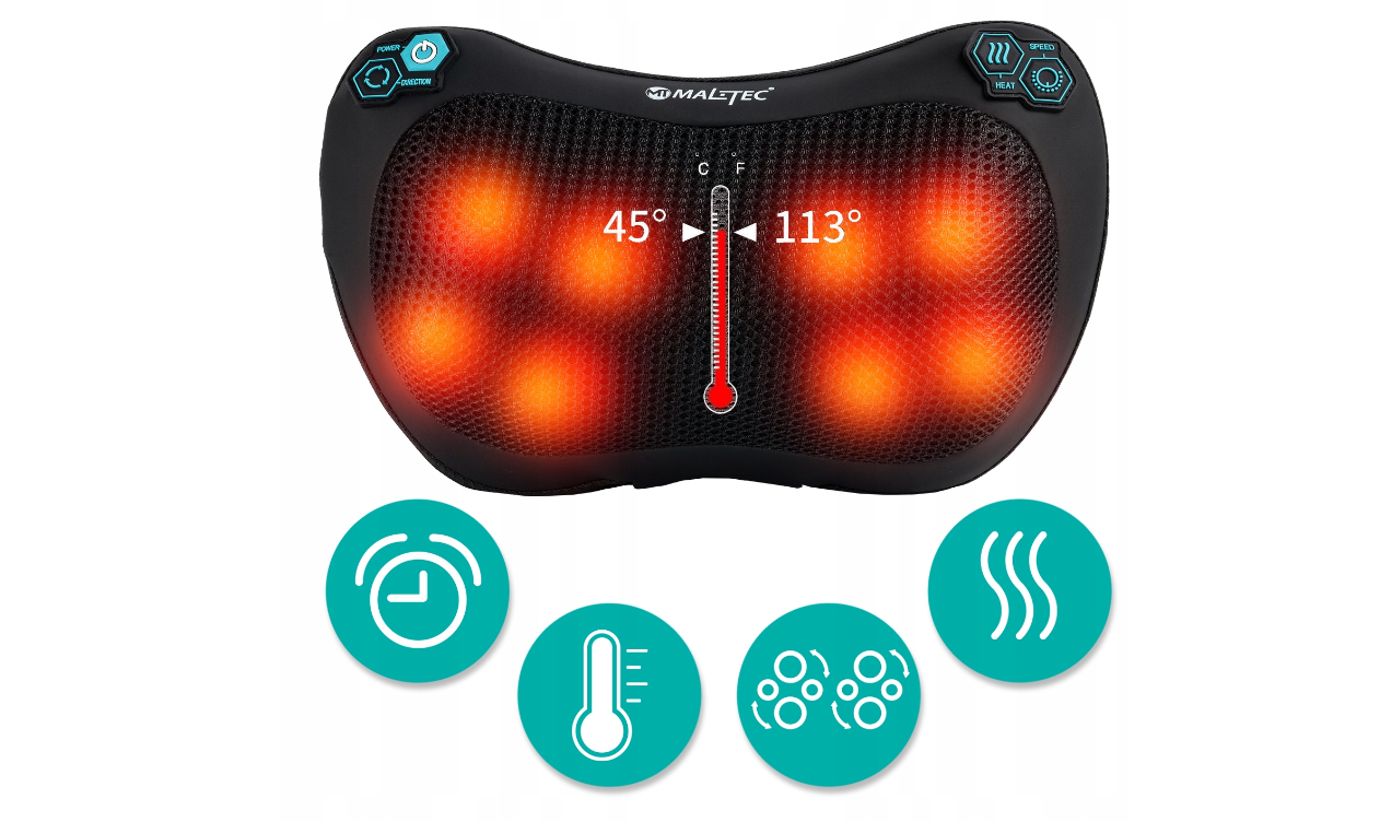 Aparatul de masaj MalTec poate fi folosit si ca perna lombara, permitandu-va sa scapati de durerile cauzate de sederea prelungita. Masajul incalzeste muschiisi imbunatateste circulatia sangelui, accelerand regenerarea tesuturilor deteriorate.