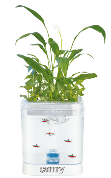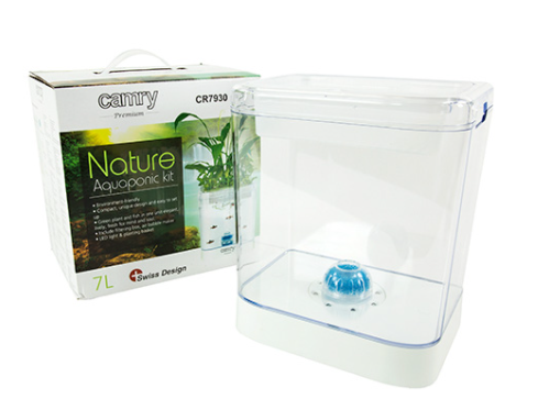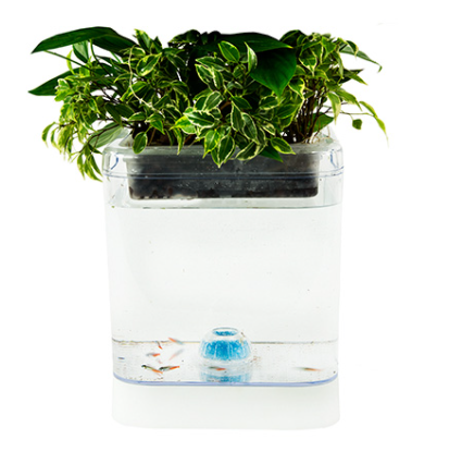 Setul pentru acvariu este un decor unic pentru persoanele care apreciaza obiectele care sunt atat de placute, cat si practice. Partea inferioara este un acvariu pentru pesti mici, echipat cu un filtru si un aerator. Deasupra acvariului exista un cos cu flori cu o incarcatura de bile ceramice. Intregul nu este doar un element unic de decor, ci si utilizarea estetica a spatiului de deasupra acvariului, care de obicei nu este dezvoltat. Pentru a creste valoarea vizuala, setul are o lumina de fundal cu LED alb.