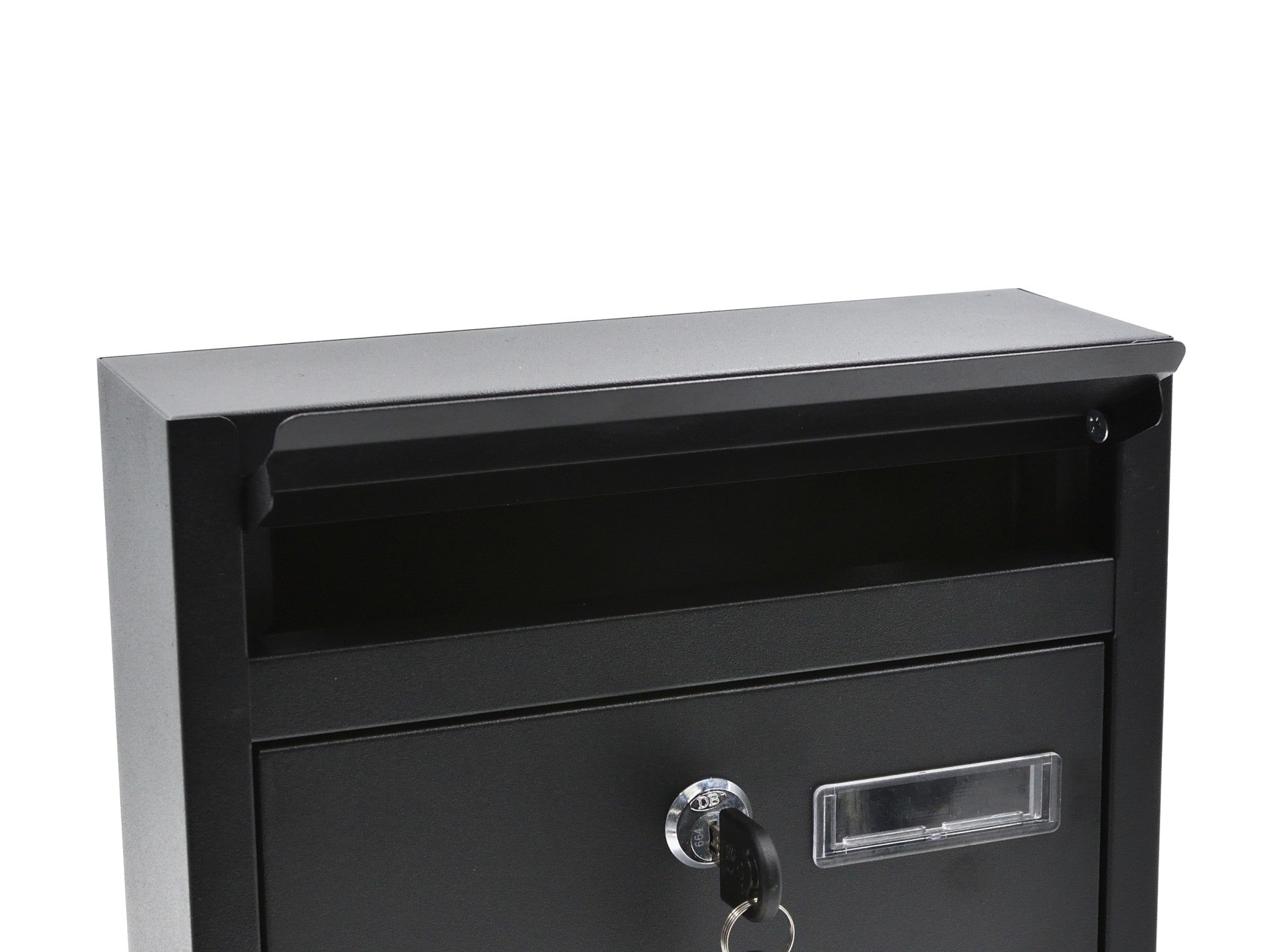 Cutia postala este fabricata din otel zincat, care o protejeaza perfect impotriva conditiilor meteorologice nefavorabile. Cutia cu dimensiuni de 320x240x80mm are o intrare acoperita, clapeta inclinata in sus protejeaza eficient continutul cutiei de ploaie, in timp ce orificiile de ventilatie permit evaporarea umezelii care poate fi in interiorul cutiei intr-un mod natural. Usa care se deschide spre fata are o fereastra in care puteti pune un marcaj de adresa, serveste si ca o spiona prin care putem verifica daca exista vreo corespondenta in cutie.