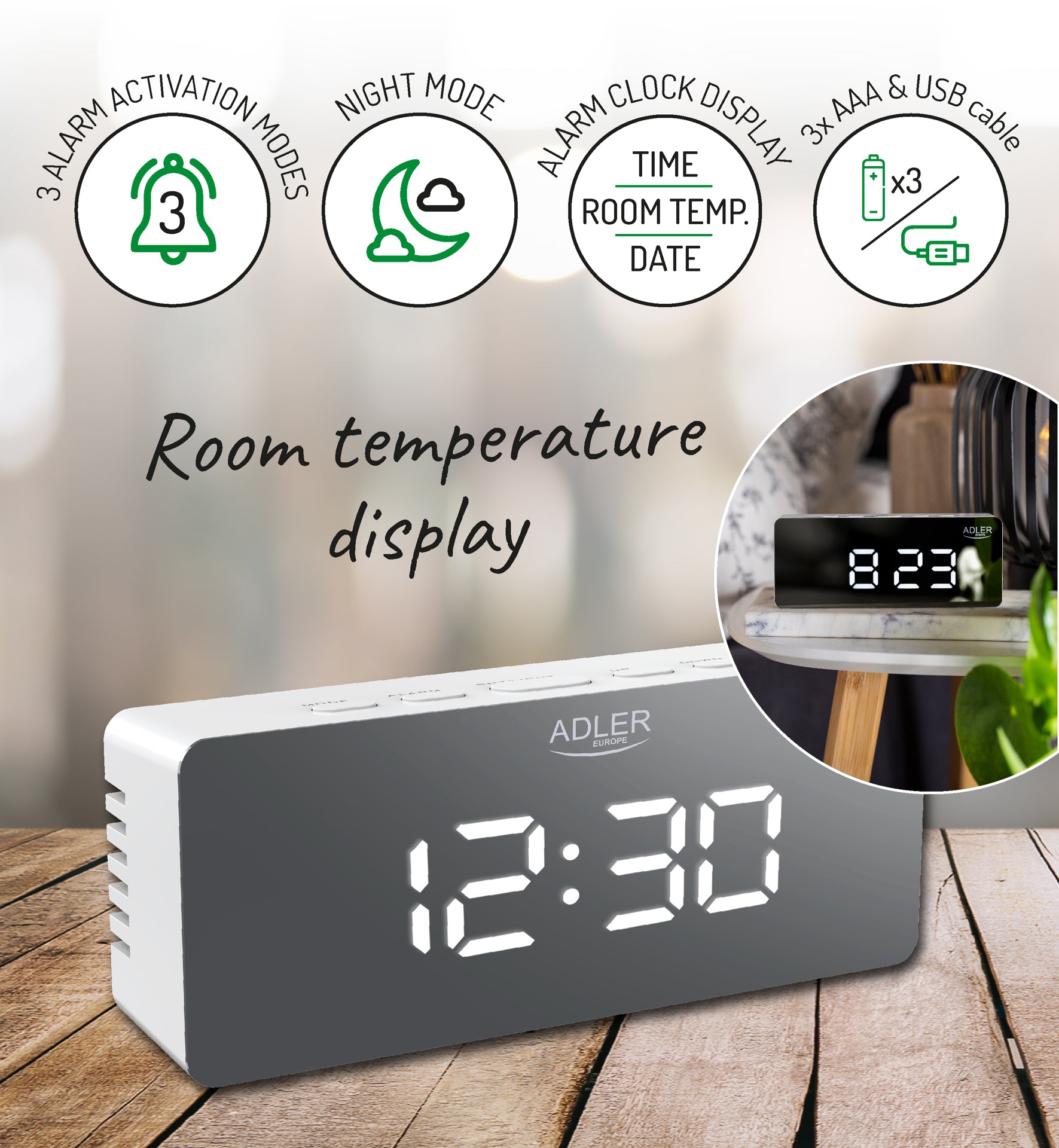 Ceasul desteptator AD 1189 este un dispozitiv cu multe functii utile pe care le poti alege in functie de nevoile tale. In primul rand, are 3 moduri de activare a alarmei. Marele avantaj este afisajul LED lizibil, de pe care poti citi cu usurinta ora si temperatura din camera in toate conditiile de iluminare. Ceasul desteptator este alimentat de la retea, are si o sursa de alimentare cu baterie incorporata. Ceasul cu alarma arata temperatura din interiorul camerei.