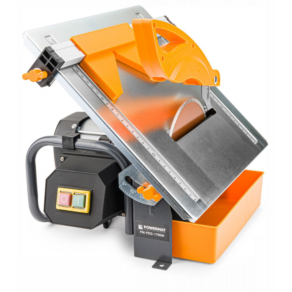 Cutterul are un domeniu de reglare a inclinarii de la 90 ° la 45 ° si un domeniu de taiere a materialului de la 18 mm la 34 mm. Taietorul este conceput pentru taierea precisa a tuturor tipurilor de placi, poate fi folosit si ca taietor de lemn. Masina de taiat POWERMAT PM-PDG-1700M este o masina excelenta pentru taierea precisa a tuturor tipurilor de placi. Echipat cu o lama diamantata si un rezervor de apa pentru racirea lamei. Sistemul de functionare umed cu apa utilizata in dispozitiv permite o functionare aproape fara praf. Datorita dispozitivului, puteti taia placile standard, atat in unghi (plat), cat si in forme „diamant”. Masa este din otel zincat. Perfect pentru toate tipurile de lucrari de finisare a placilor, placilor, pietrelor, ceramicii, teracotei si gresiei. Datorita puterii sale, poate fi folosit si pentru taierea diferitelor tipuri de lemn, podele si panouri de perete, parchet, tot felul de placi si PAL.