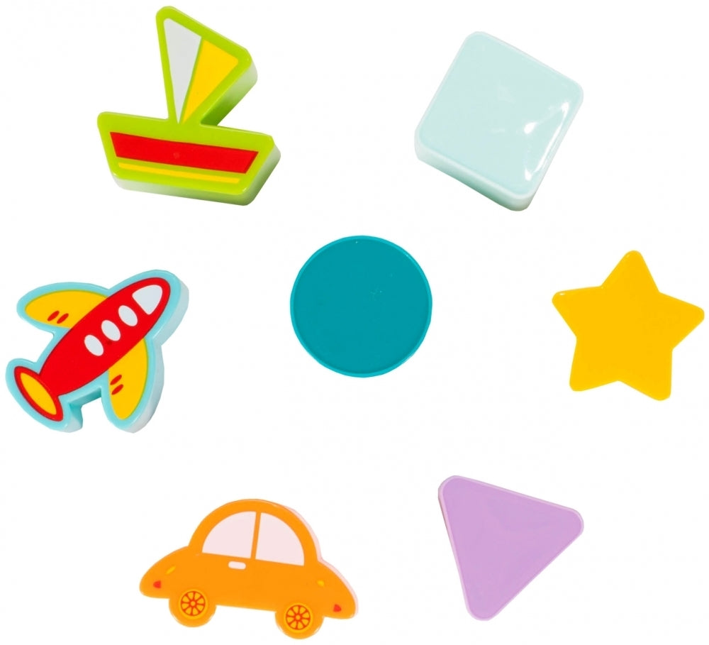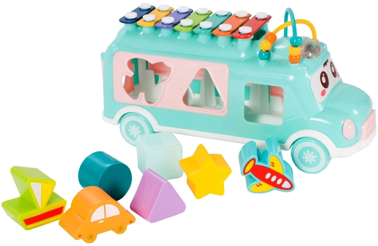 Autobuzul colorat contine trei jucarii într-una. Poate fi folosit ca instrument precum cinelele, un sortator cu blocuri în diferite forme si un vehicul obisnuit. Ferestrele de pe partile laterale ale autobuzului au forme de figuri geometrice, precum si mijloace de transport, cum ar fi o masina de jucarie, o barca si un avion. Parbrizul vehiculului prezinta modele pentru a reprezenta ochii, franjurile si obrajii înrositi. Autobuzul poate fi folosit ca instrument muzical, cum ar fi xilofonul. Bastonul este asezat sub vehicul într-un loc adecvat. De asemenea, este legat cu un sir pentru a preveni pierderea.