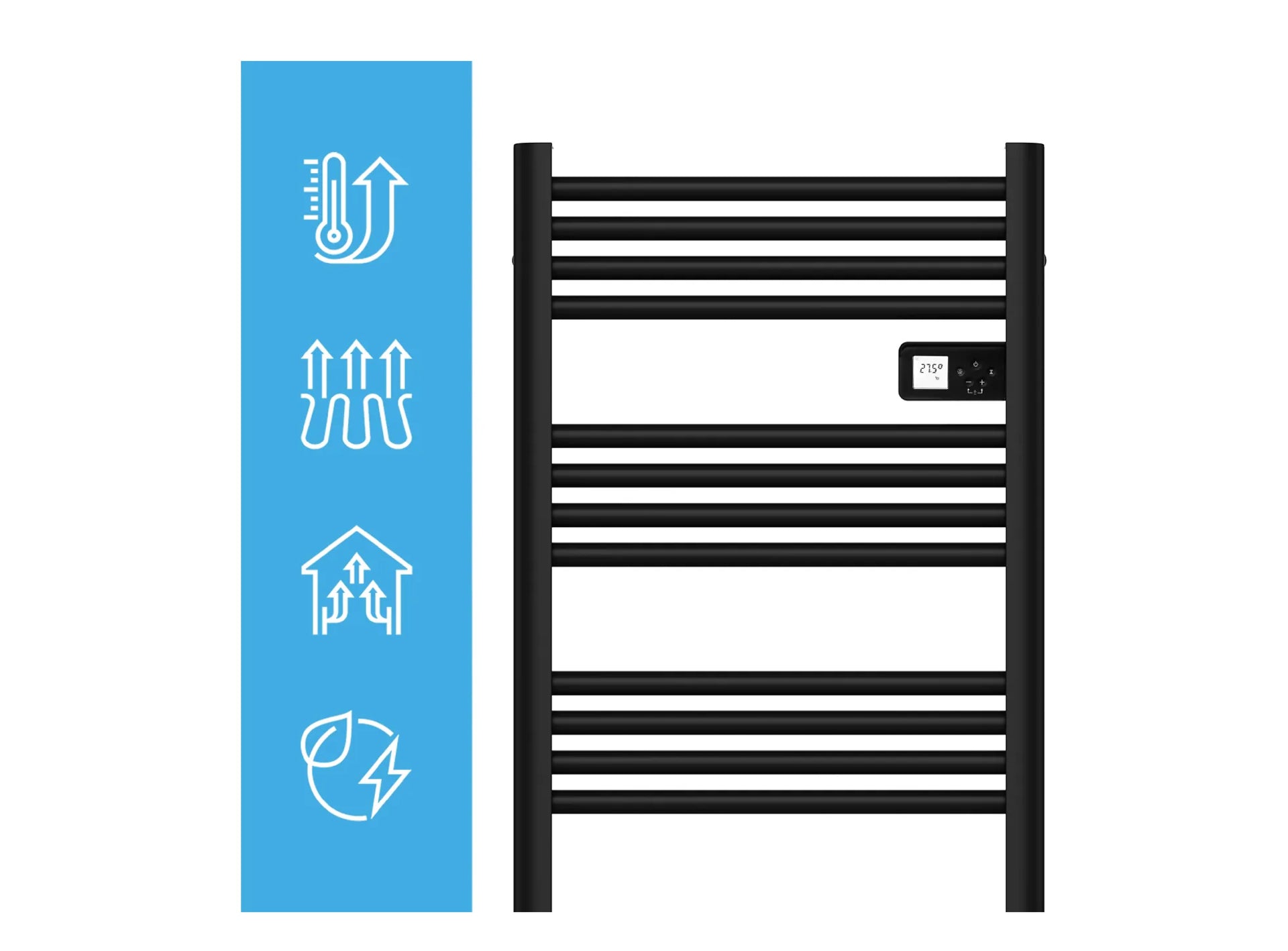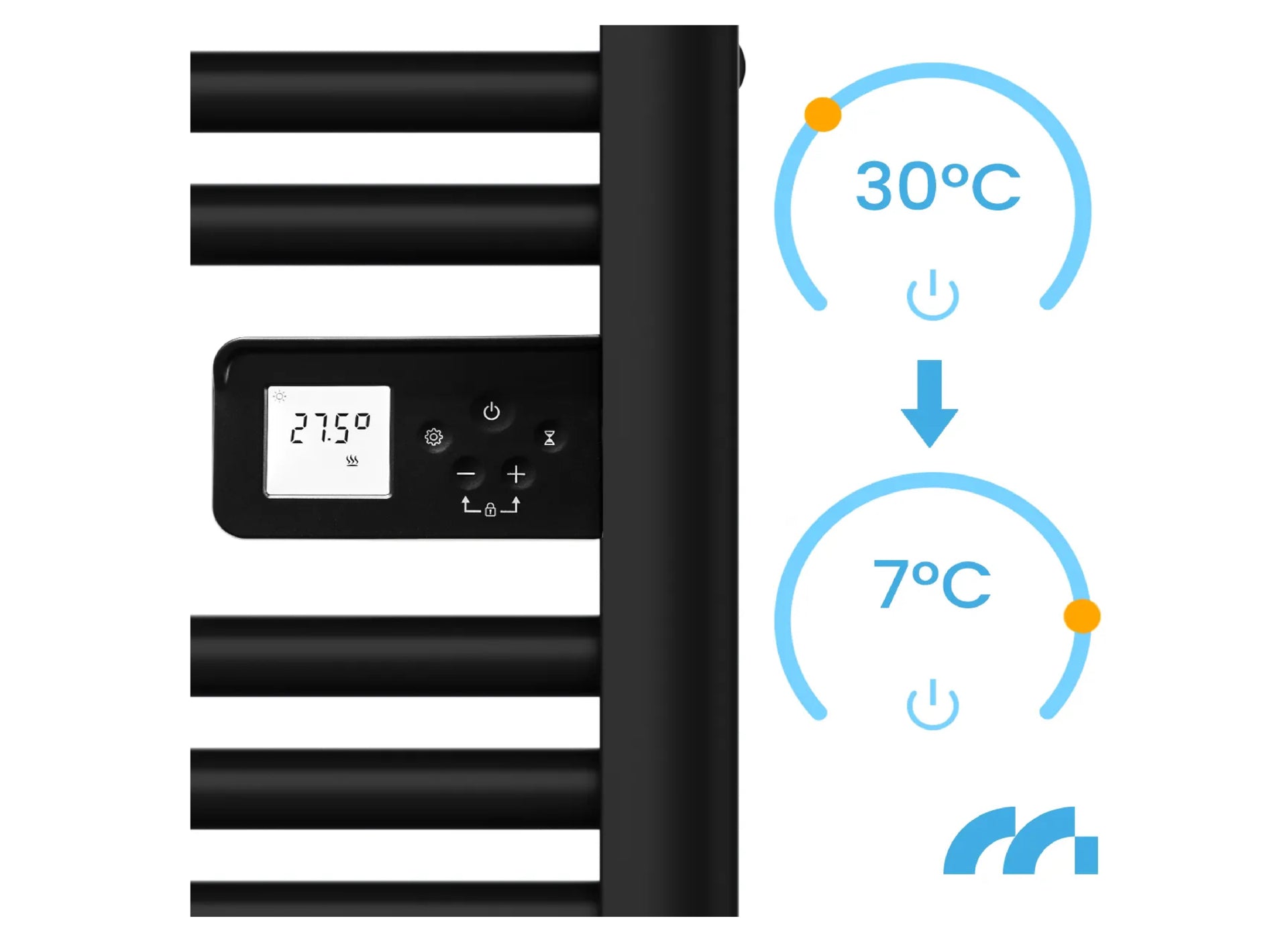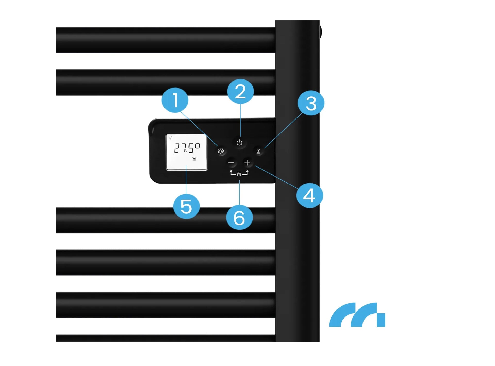 - Caloriferul de baie este echipat cu un panou de control modern cu display LCD, care va permite sa controlati cu usurinta si sa reglati cu precizie functionarea dispozitivului la nevoile dumneavoastra. Panoul va permite sa controlati pe deplin toate functiile radiatorului, cum ar fi: