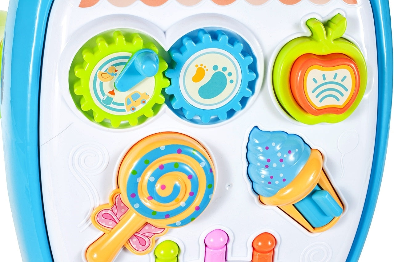 Un împingător multifuncțional special conceput, care facilitează învățarea copiilor de mers pe jos și este un element indispensabil al diverselor jocuri de acasă. Este proiectat astfel încât copilul să se poată deplasa stabil și confortabil în timp ce ține mânerul. Când copilul se satură să meargă, va găsi o mulțime de jocuri interesante care îl vor motiva doar să continue să folosească călătoria. Împingătorul este echipat cu un panou, un adevărat centru de joacă mobil cu muzică și sunete, complet funcțional și pentru un copil care încă nu merge și poate juca în timp ce stă. Există un recipient cu bile de plastic pe spatele walker-ului. Bilele pot fi îndepărtate prin îndepărtarea tortului de pe panoul frontal. De dragul celor mai mici copii, jucăria este fabricată dintr-un material de cea mai înaltă calitate, cald și plăcut la atingere și, în plus, durabilă, cu un scop special pentru copiii mici.