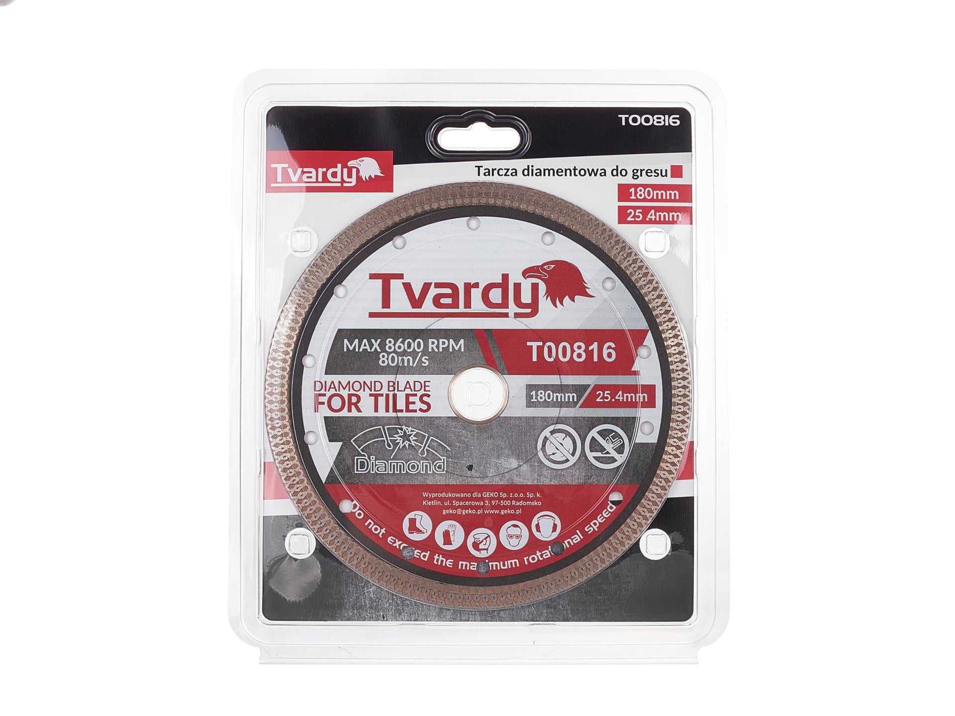 Disc diamantat profesional pentru gresie de la Tvardy . Discul are o janta canelata cu profil inchis si este destinat taierii materialelor dure precum gresie portelanata, marmura, tigle, granit, gresie, cuart . Disc diamantat cu un diametru de 180 mm si o grosime de 1,4 mm . Are o granulatie diamantata de 10 mm inaltime si 1,8 mm grosime.