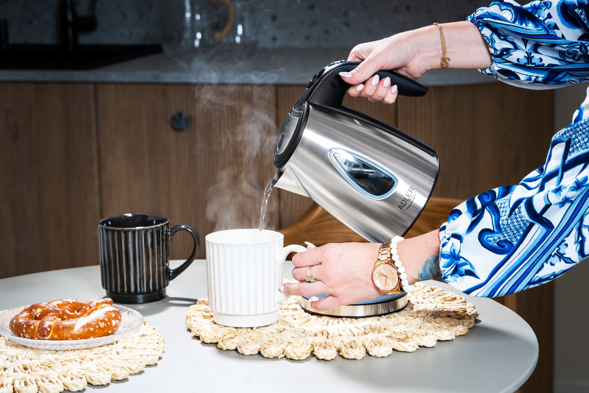 Fierbatorul electric clasic de 1 litru este util in fiecare bucatarie, birou si camin pentru studenti. Din motive de siguranta, este echipat cu o oprire automata care protejeaza fierbatorul de fierbere uscata si opreste fierbatorul imediat dupa ce apa fierbe. Fierbatorul este echipat cu un filtru care opreste sedimentele ceea ce imbunatateste gustul si calitatea apei. Functionalitatea sa este sporita de o baza stabila si un indicator luminos al nivelului apei. Fierbatorul este fabricat din otel inoxidabil si este echipat cu un element de incalzire puternic de 1630 W, ceea ce il face un maestru de sprint in fierberea apei. Designul modern al ceainicului si carcasa argintie sunt completate cu o lumina pilot LED care informeaza ca apa tocmai a fiert.