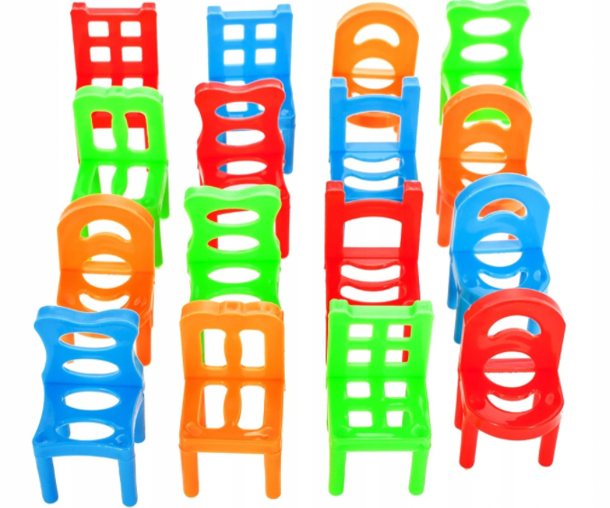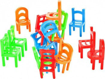 Setul este format din 18 scaune in 3 culori, reprezentand jucatorul. Cel care reuseate sa scape de toate scaunele castiga.
