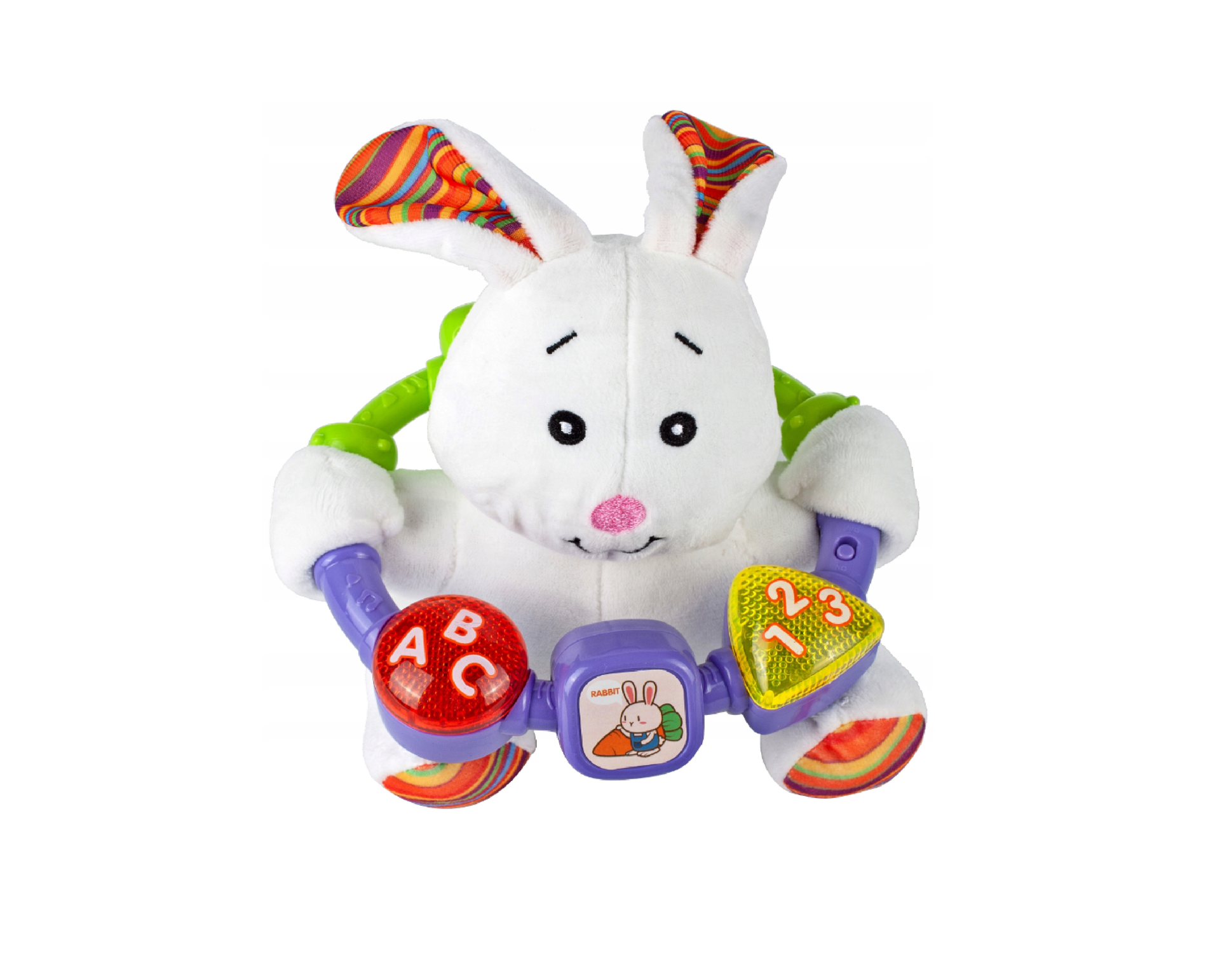 6. Butonul 123 - se aprinde, scoate sunete ale unui copil care rade, iepurasul spune mama si tata si fredoneaza cantece.