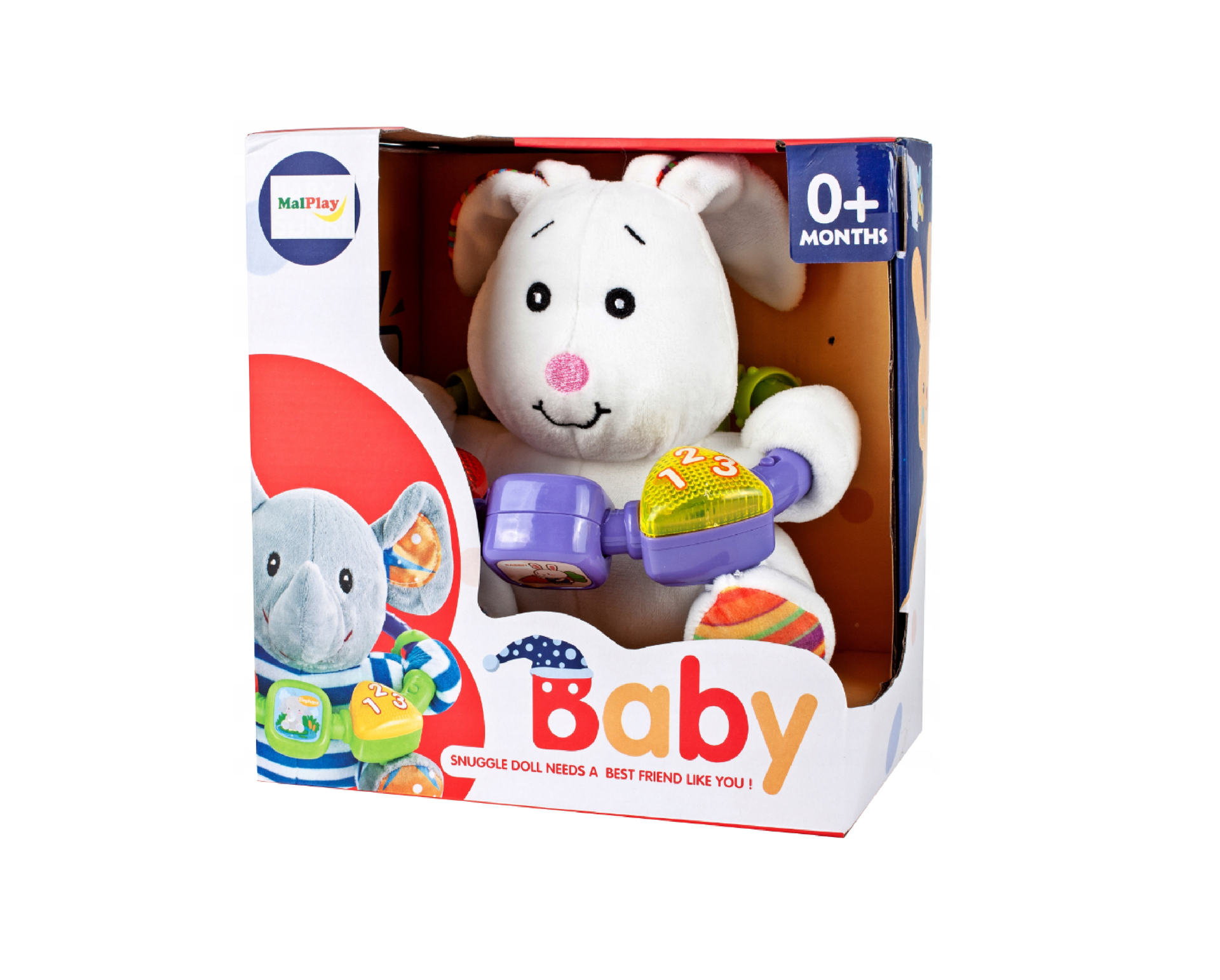 Iepurasul are, de asemenea, un cub care se roteste in mijloc care zdranganeste atunci cand este mutat.
