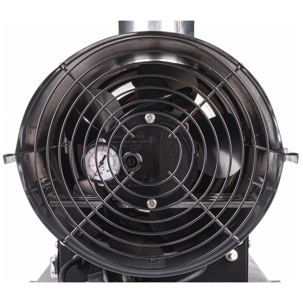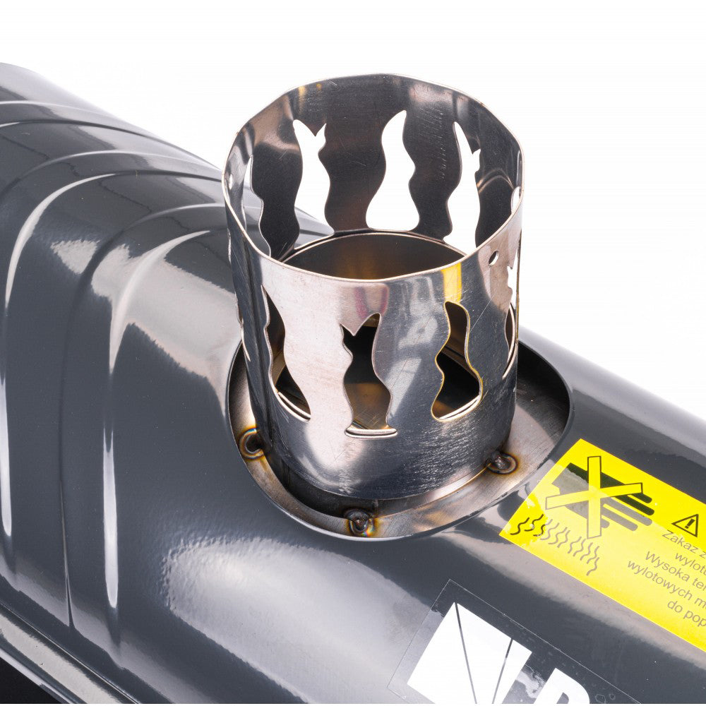 Flacara incalzeste schimbatorul de caldura, iar gazele de esapament sunt evacuate in exterior prin cosul de fum din partea superioara a carcasei. Energia termica este transferata in aerul din jurul schimbatorului si este suflata din incalzitor sub forma unui curent uniform de aer curat si cald.