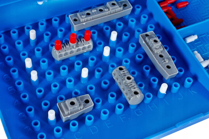 REGULI DE JOC: Asezati-va navele oriunde (vertical sau orizontal) în partea de jos a placii. Amintiti-va ca nu puteti schimba pozitia lor în timpul jocului. Fiecare jucator da alternativ coordonatele loviturii, pe care le indica spunand, de exemplu, C7. În cazul unei lovituri, jucatorul continua sa traga pana rateaza, iar primul jucator care scufunda toate navele inamice castiga.