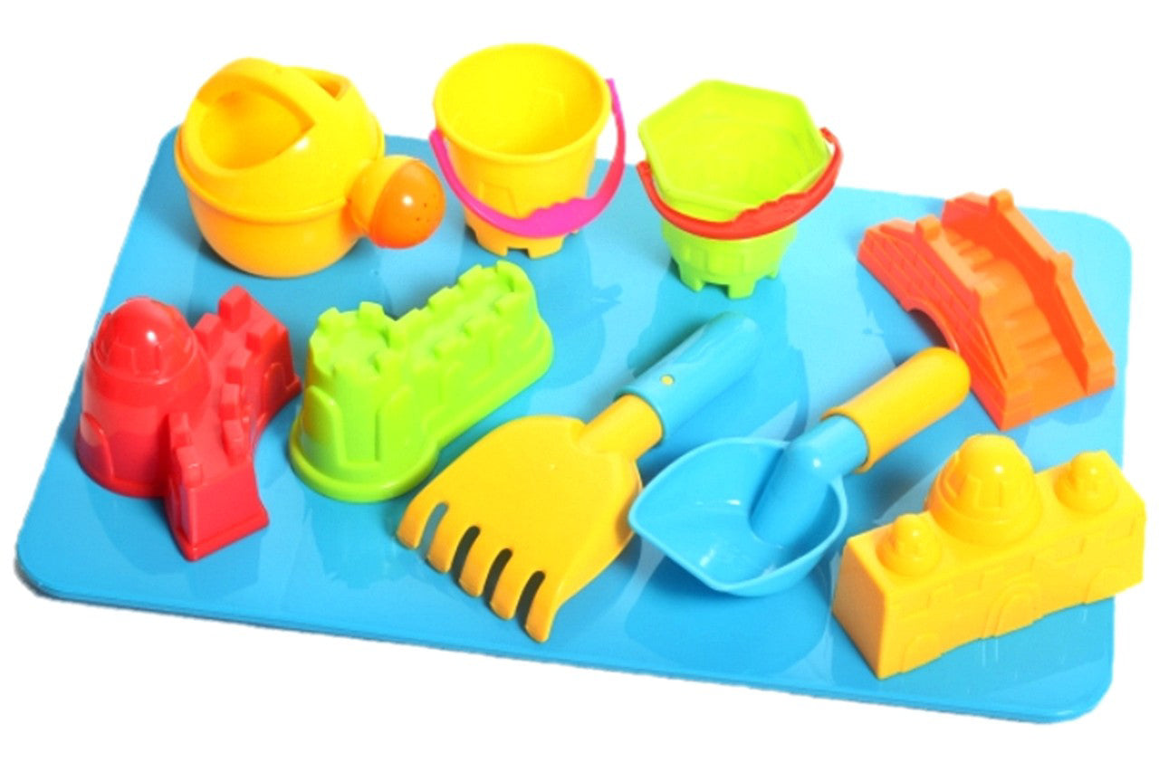 Setul contine: masa cu picioare, capac de plastic, 2 galeti, spatula, grebla, 4 matrite, stropitoare.