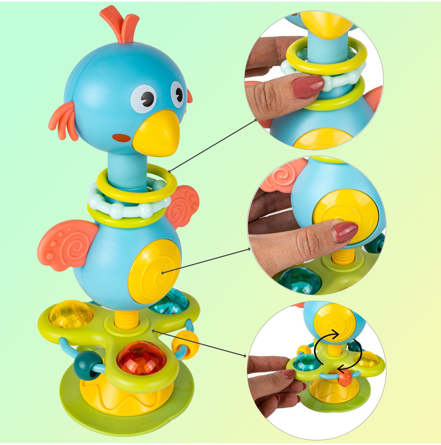 Rasucirea, tragerea si strangerea elementelor individuale ale jucariei ajuta la dezvoltarea abilitatilor motorii ale copilului si a coordonarii ochi-mana.