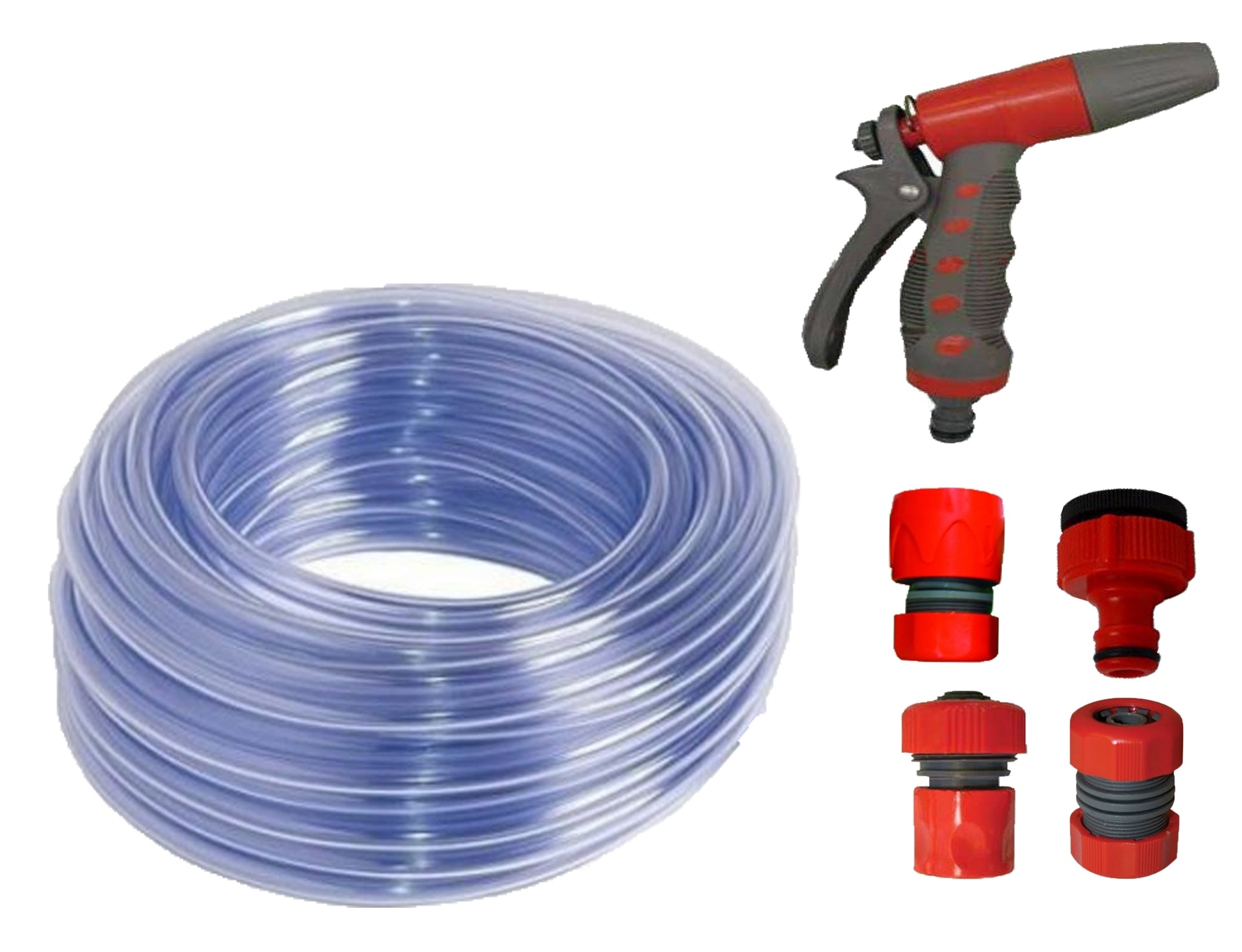 Kit gradina, furtun silicon 3/4", pistol multifunctional, conector furtun 3/4", adaptor pentru robinet 1/2-3/4-1", conector cu stop 3/4, conector imbinare 3/4"