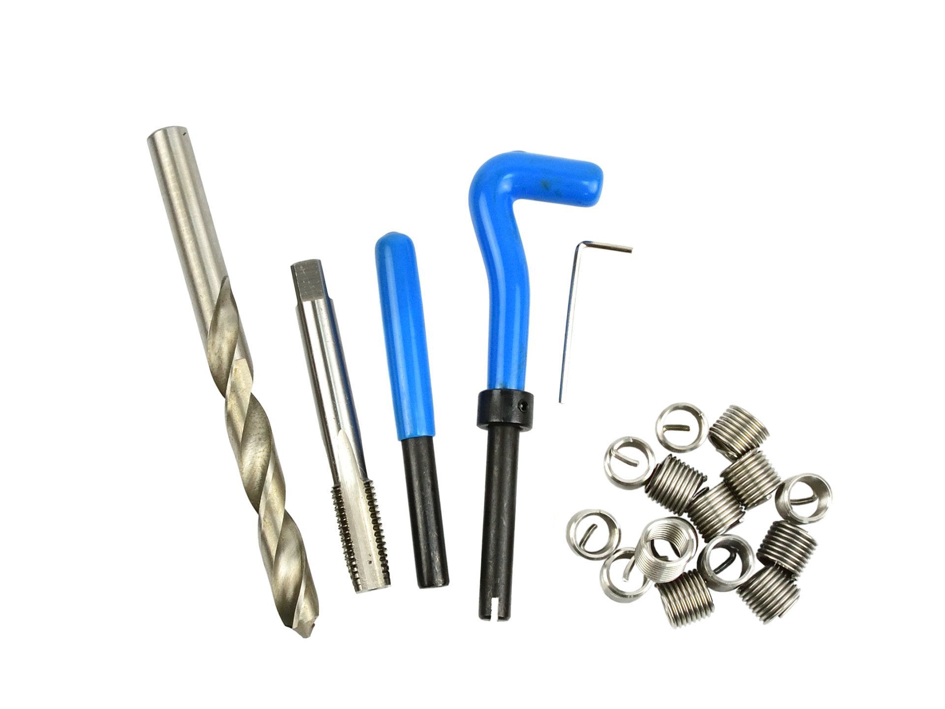 Set pentru repararea filetelor rupte si deteriorate M12x1.75mm . Setul include un robinet si burghiu din otel de mare viteza HSS4341 de inalta calitate, un buton de ghidare, un poanson si un set de insertii spiralate.