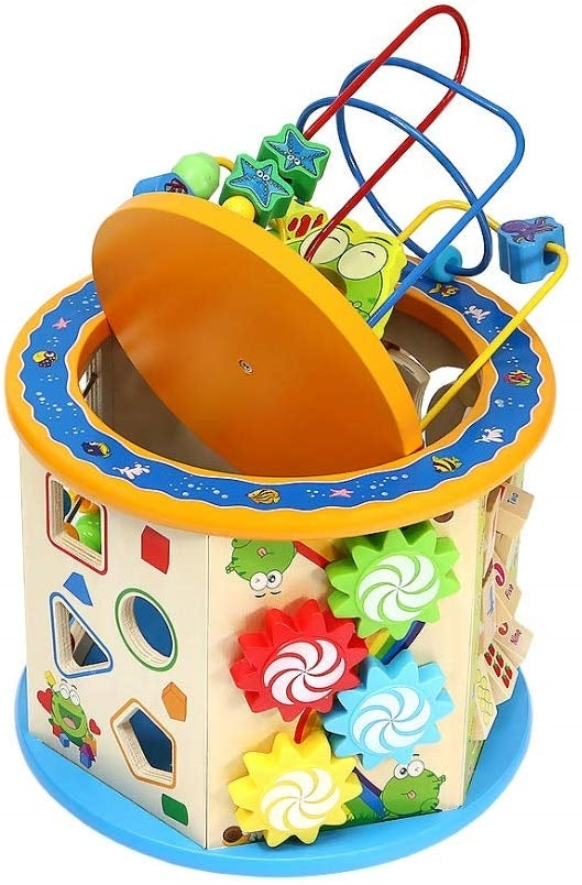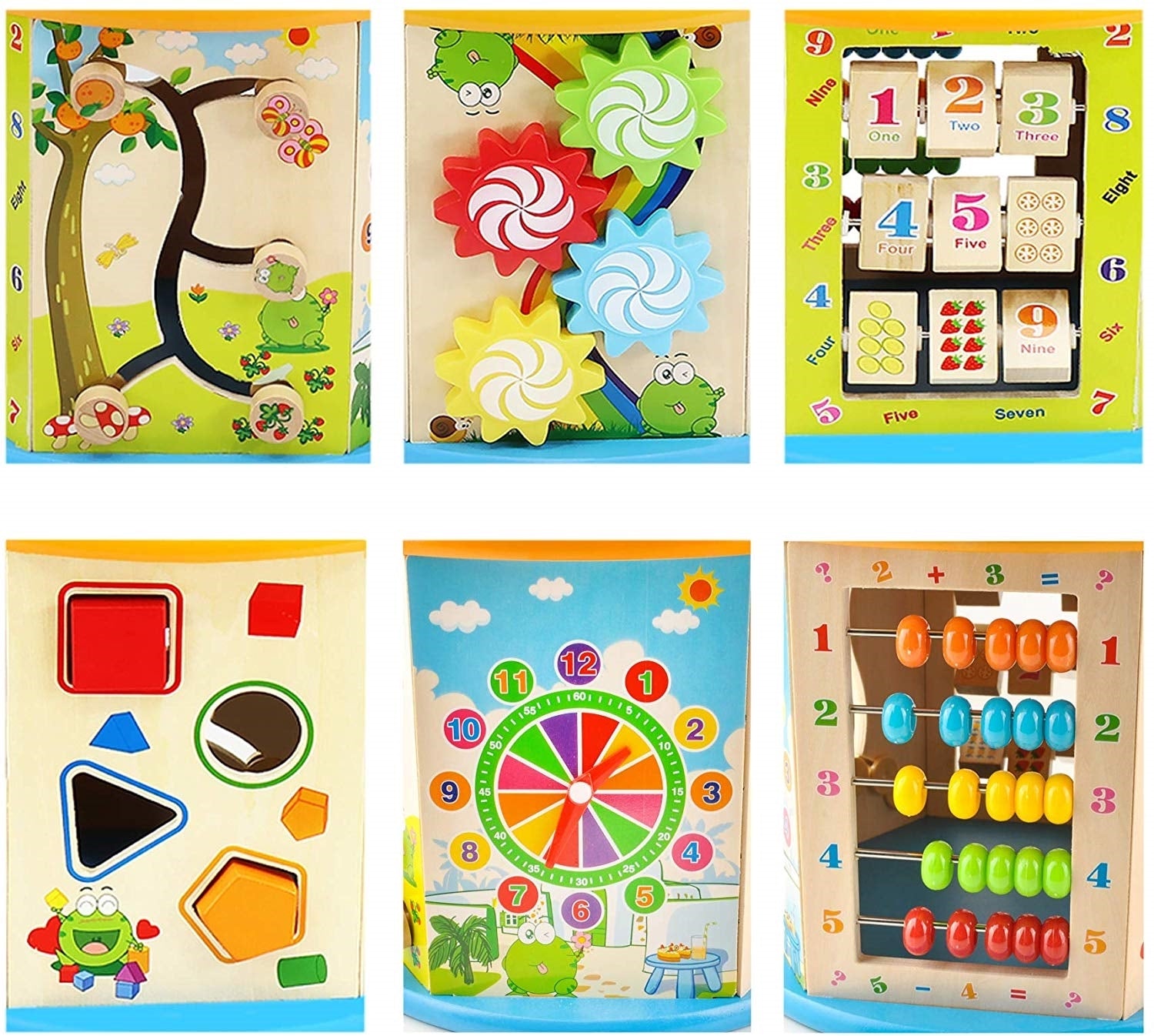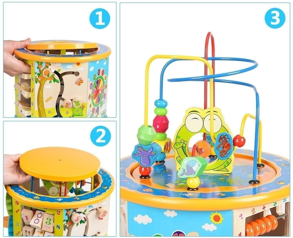 Bucla, blocurile rotative reprezintă numerele și numele lor englezești, ceas, sortator cu blocuri de lemn, labirint cu animale, abacus, stele rotative, pe fundul jucăriei - un joc de masă.