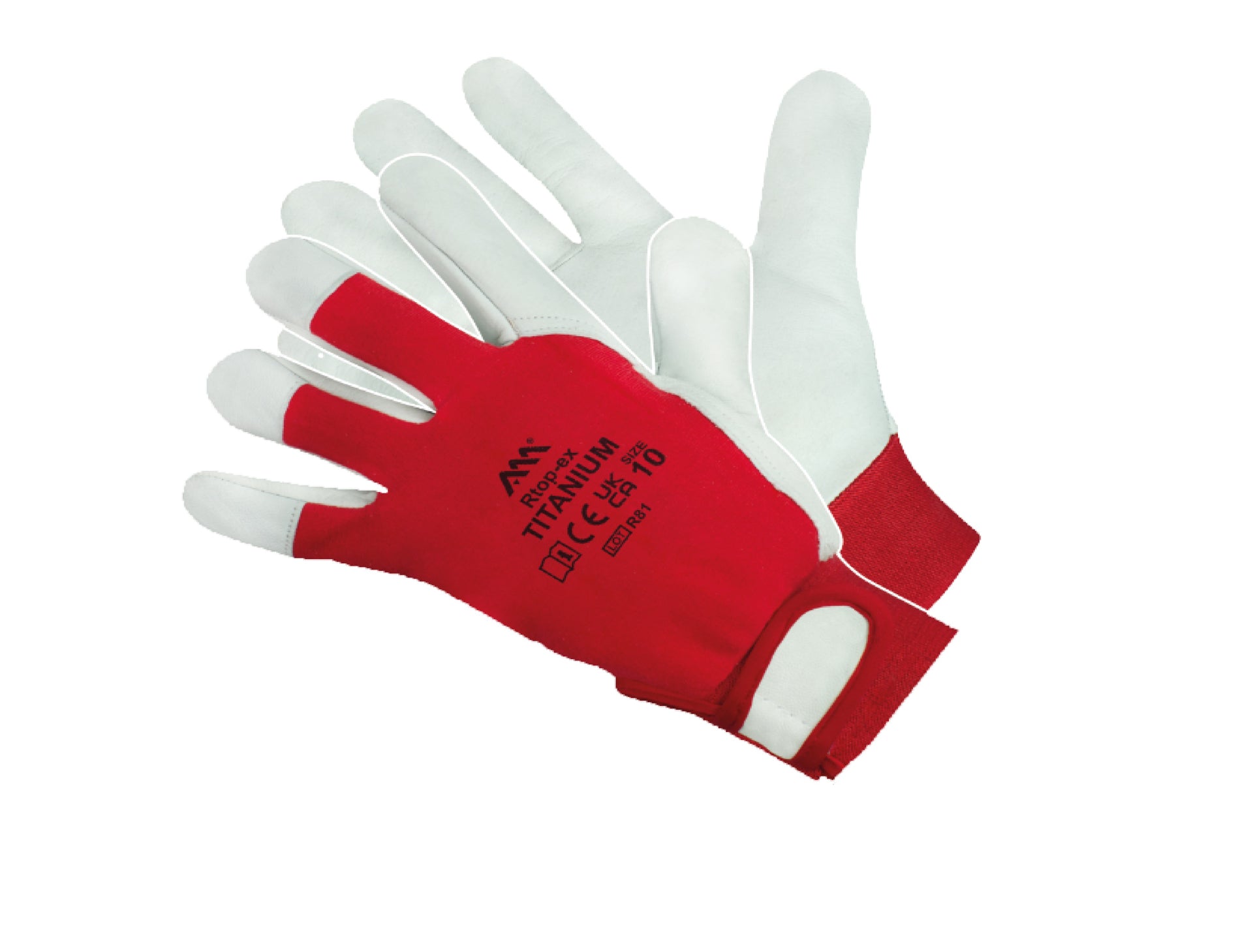 Manusi de protectie cu cinci degete, din piele de vaca de inalta calitate, de culoare naturala, cu tricot elastic din bumbac rosu pe spate.