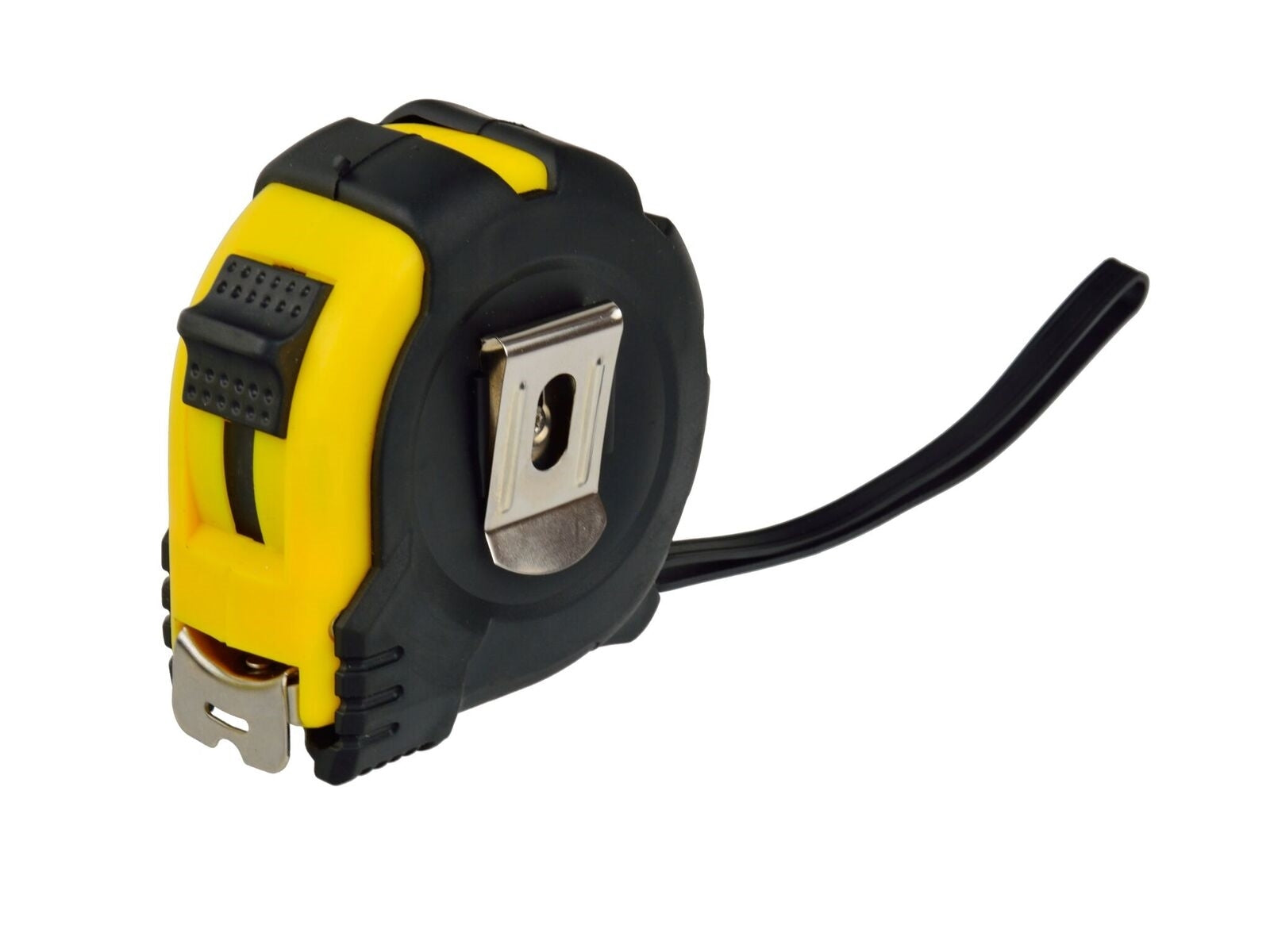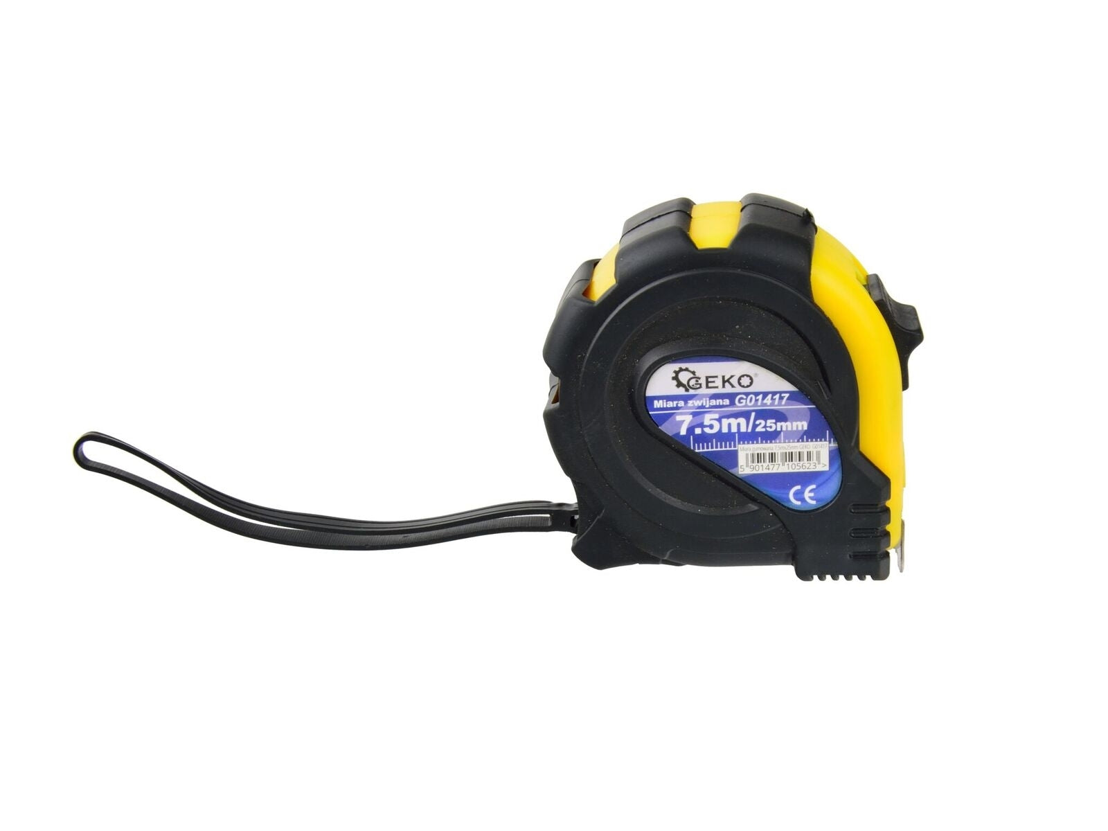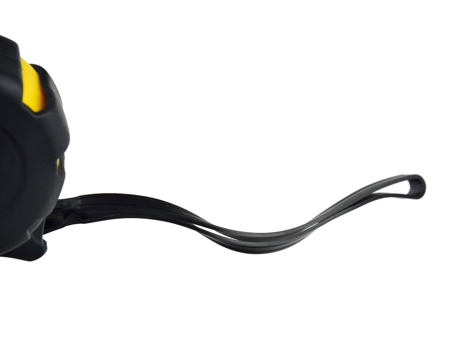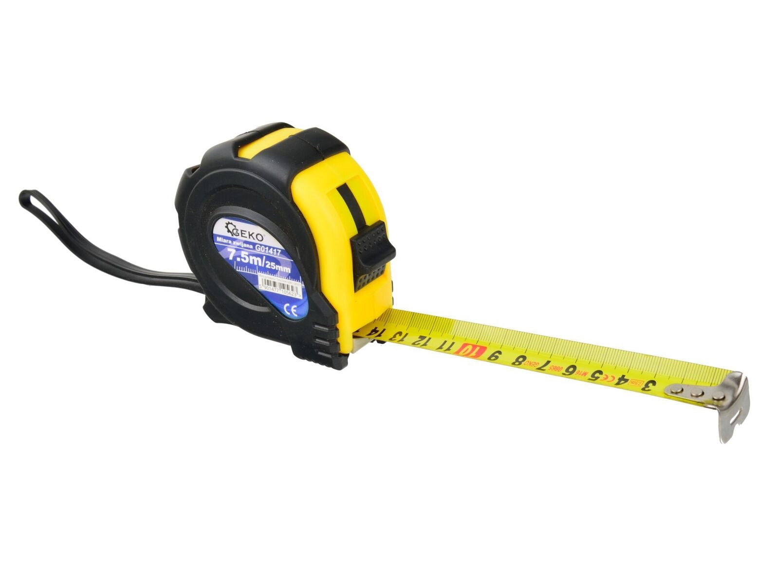 Banda de masurare, banda de otel cu incuietoare. Banda are 7,5 m lungime, 25 mm latime si 0,135 mm grosime. Banda de otel carbon se termina cu un carlig solid de masurare. Carcasa cupei de masurare este fabricata din plastic ABS cu capac de cauciuc. O scala neteda si lizibila face ca masurarea sa fie usor de citit. Buton de blocare cu operare degetul mare
