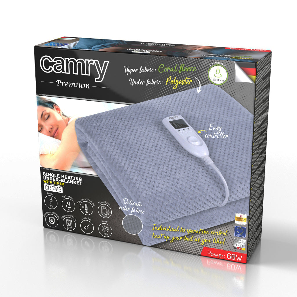Patura electrica Camry va ofera caldura relaxanta si confort. Este recomandat persoanelor care au grija de sanatatea lor. Patura electrica calmeaza nevralgiile, ajuta la relaxarea muschilor si imbunatateste circulatia sangelui. Recomandat in tratarea simptomelor artritei si reumatismului Va ofera o distributie rapida si uniforma a caldurii. Acest lucru va permite sa va odihniti cu placere intr-un pat cald in doar cateva minute dupa pornirea paturii electrice. Patura este confectionata din material moale si bland. Il poti spala cu usurinta dupa ce ai detasat un regulator de temperatura si un cablu de alimentare. Controlerul de temperatura va permite sa alegeti nivelul de temperatura si sa asigurati protectia la supraincalzire.