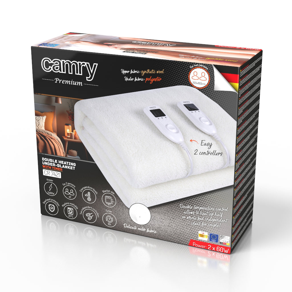 Patura electrica dubla cu temporizator, 160 x 180 cm, protectie supraincalzire, alb, Camry CR7421