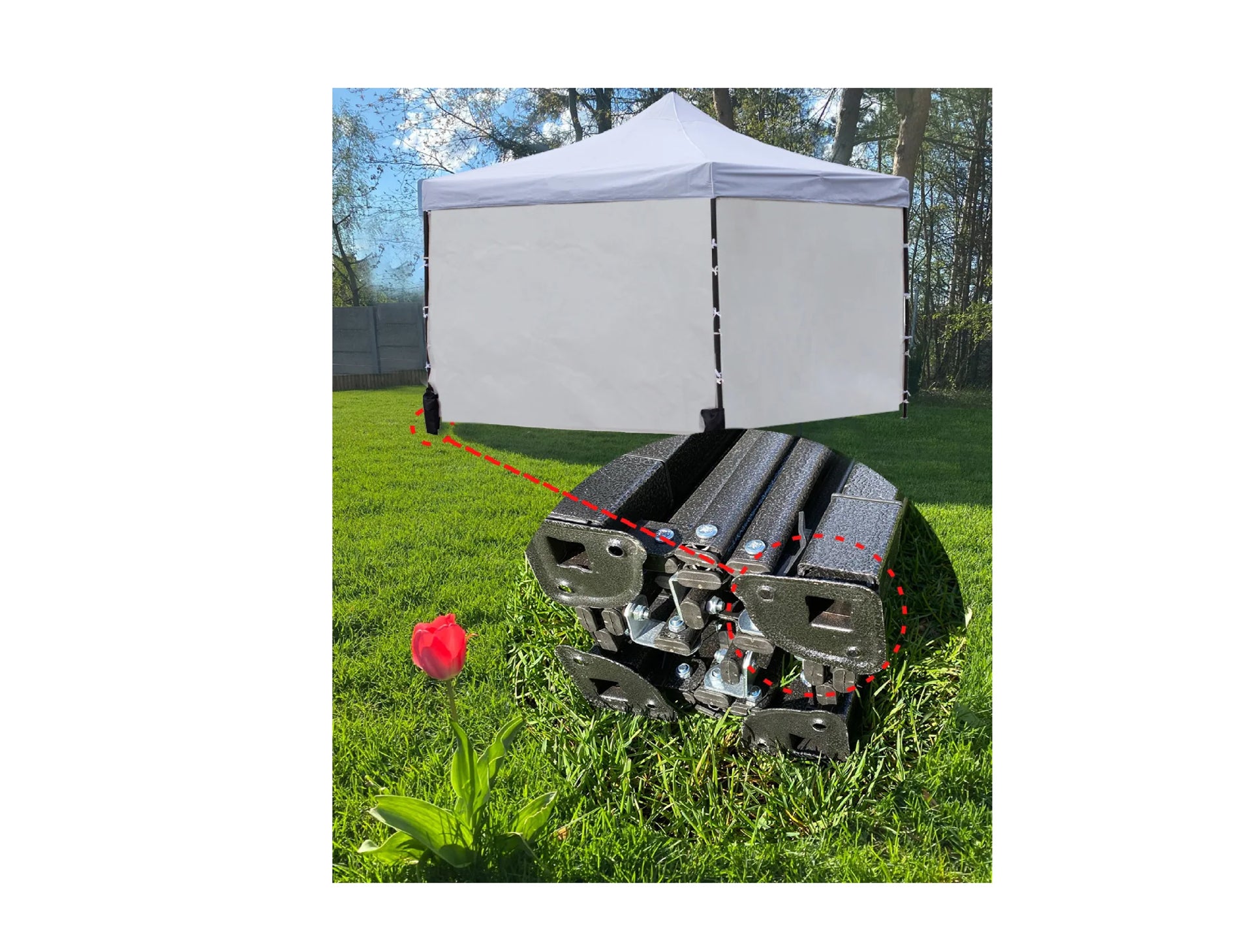 In plus, structura stabila a cortului este asigurata de picioare cu orificii de ancorare. Acestea ofera posibilitatea de atasare solida pe diferite tipuri de suprafete :