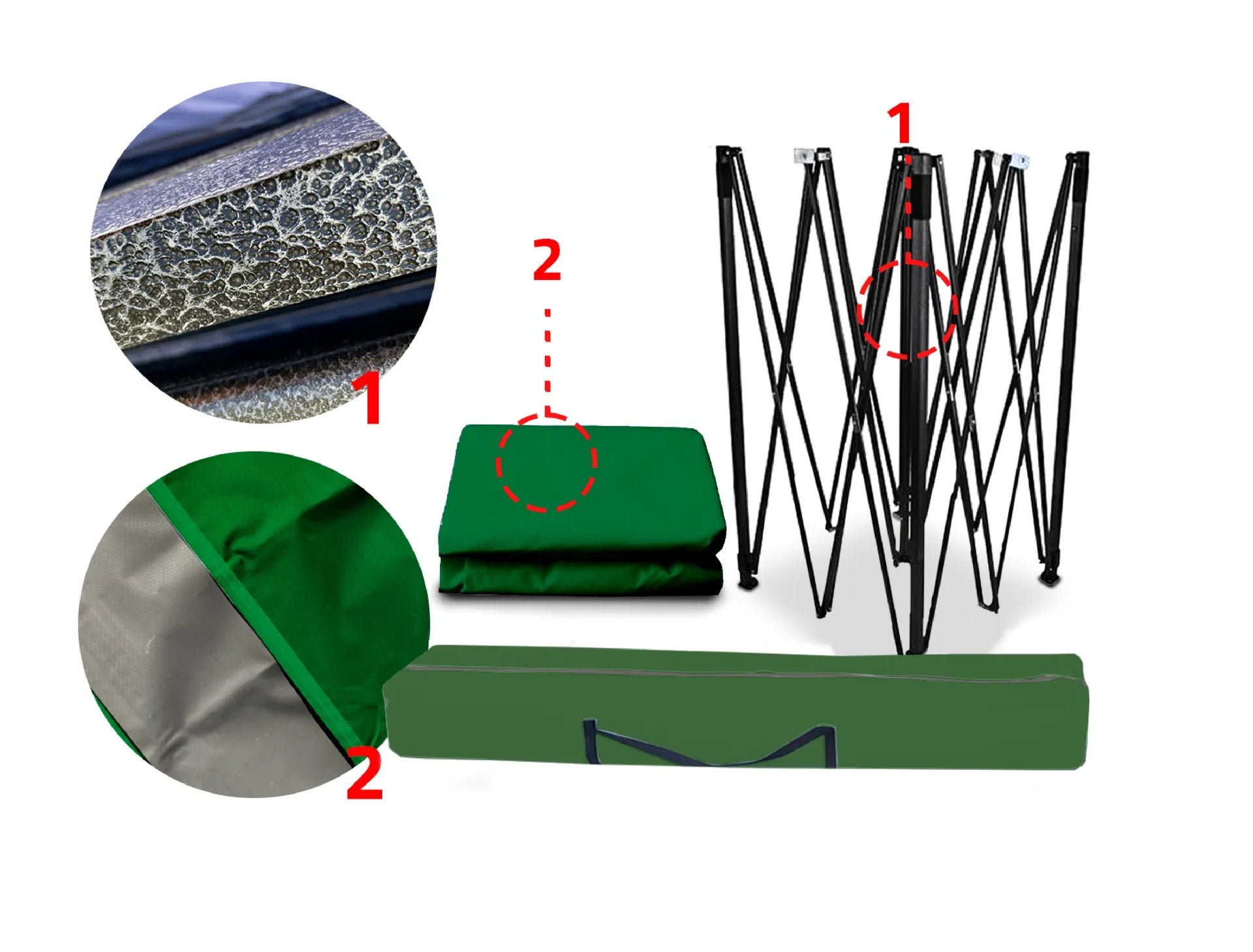 Sistemul de blocare faciliteaza asamblarea, dezasamblarea si reglarea pavilionului pliabil.