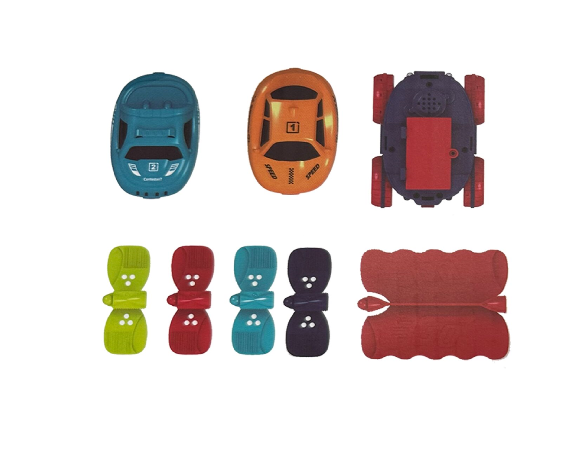 Setul include elemente colorate din care putem construi o pista de curse . In orice moment, ne putem reconstrui traseul inventand noi provocari. Veti crea spirale incitante, pante extreme si viraje stranse , apoi veti verifica cum va face fata provocarii masina de jucarie care vine cu setul . Un mecanism special de conectare face ca intreaga structura sa fie stabila si flexibila.