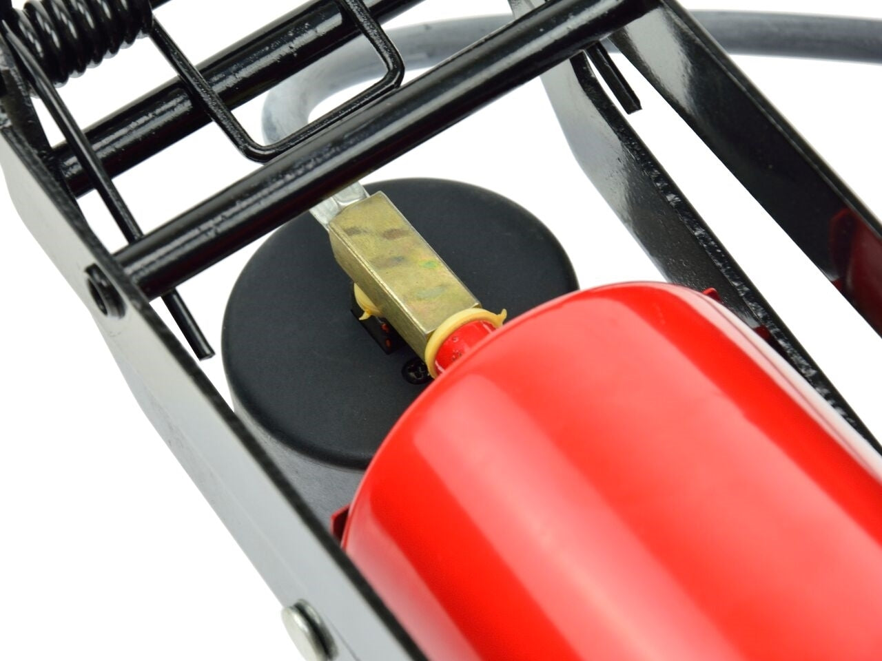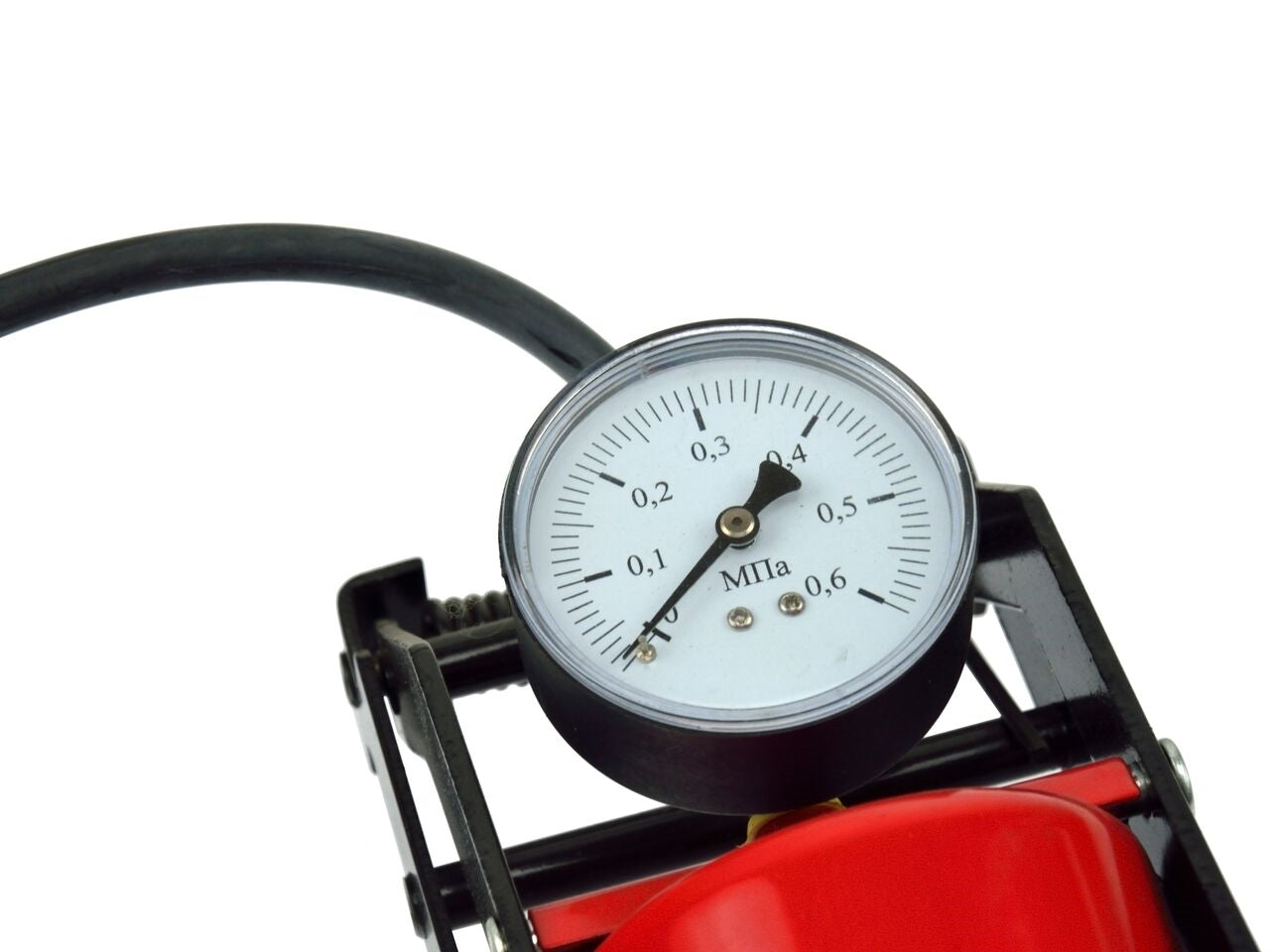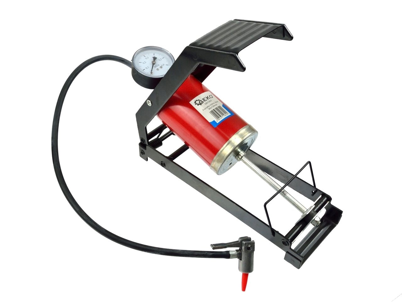 Pompa de picior cu un singur piston pentru pomparea roților autoturismelor, bicicletelor, motocicletelor, scuterelor, bilelor etc. Setul include duze universale pentru pompare, printre altele. bile și saltele.