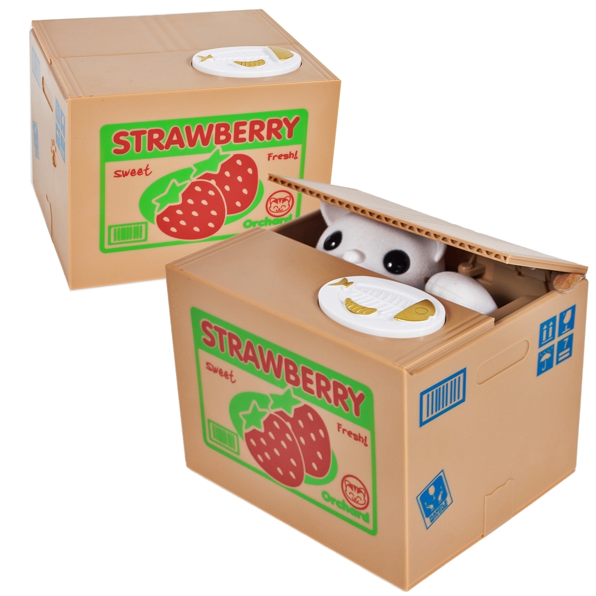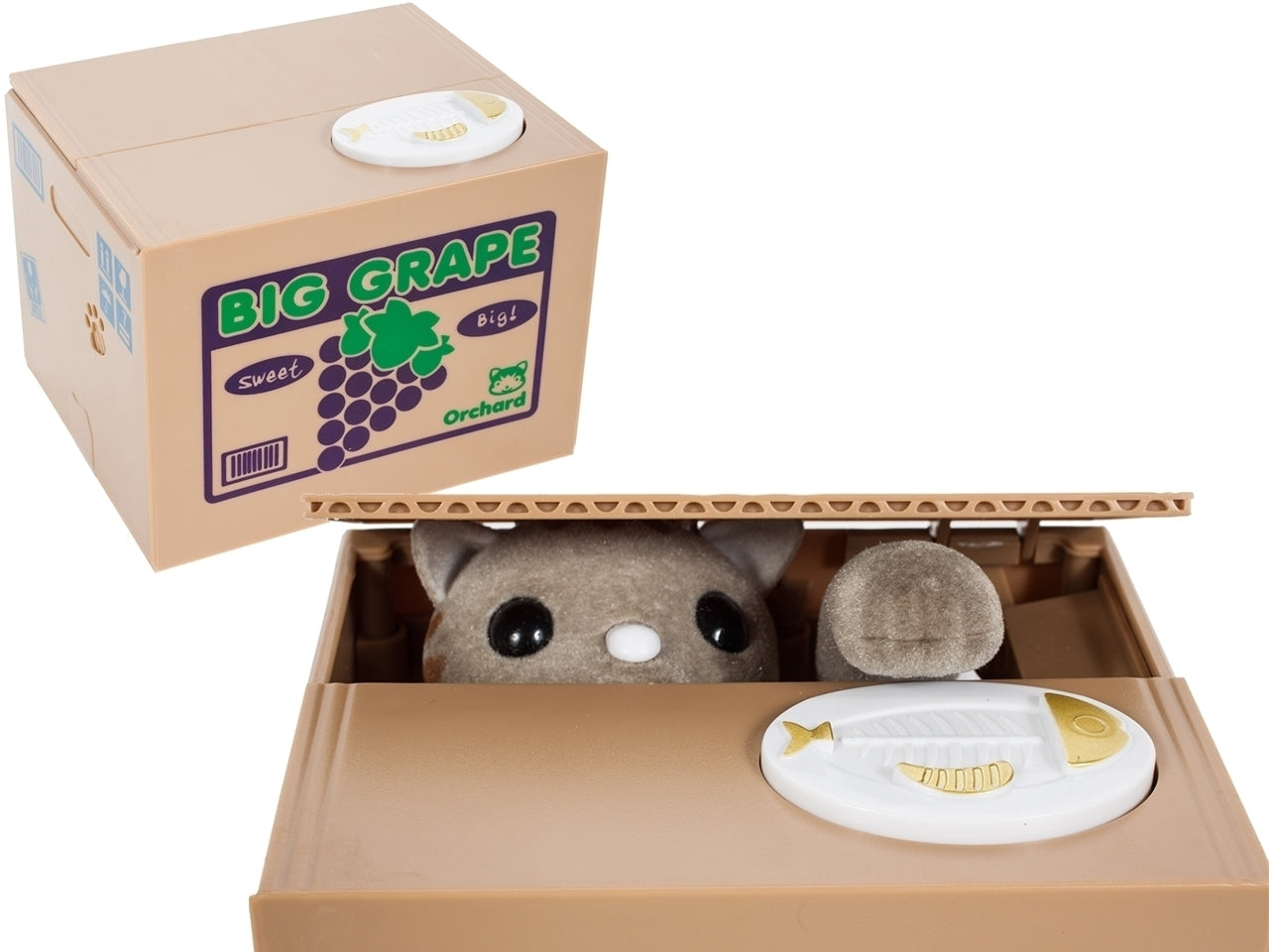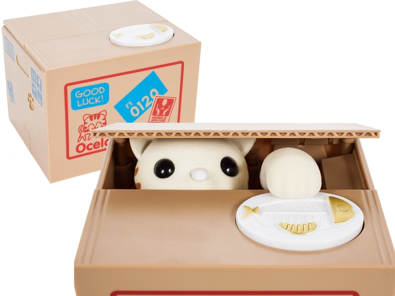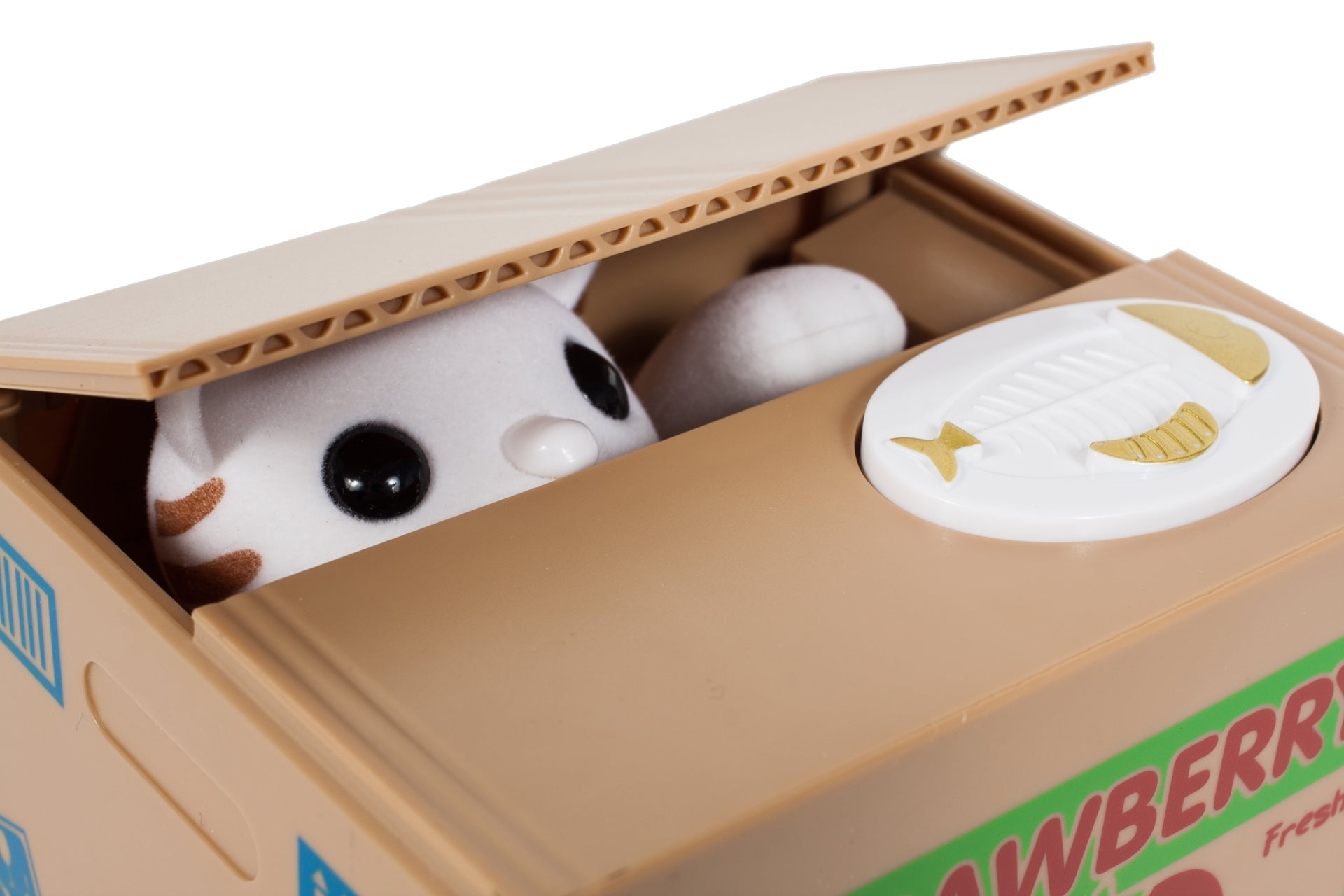 Cutie de bani interactiva din plastic, în care pisoiul colecteaza bani cu laba sa.