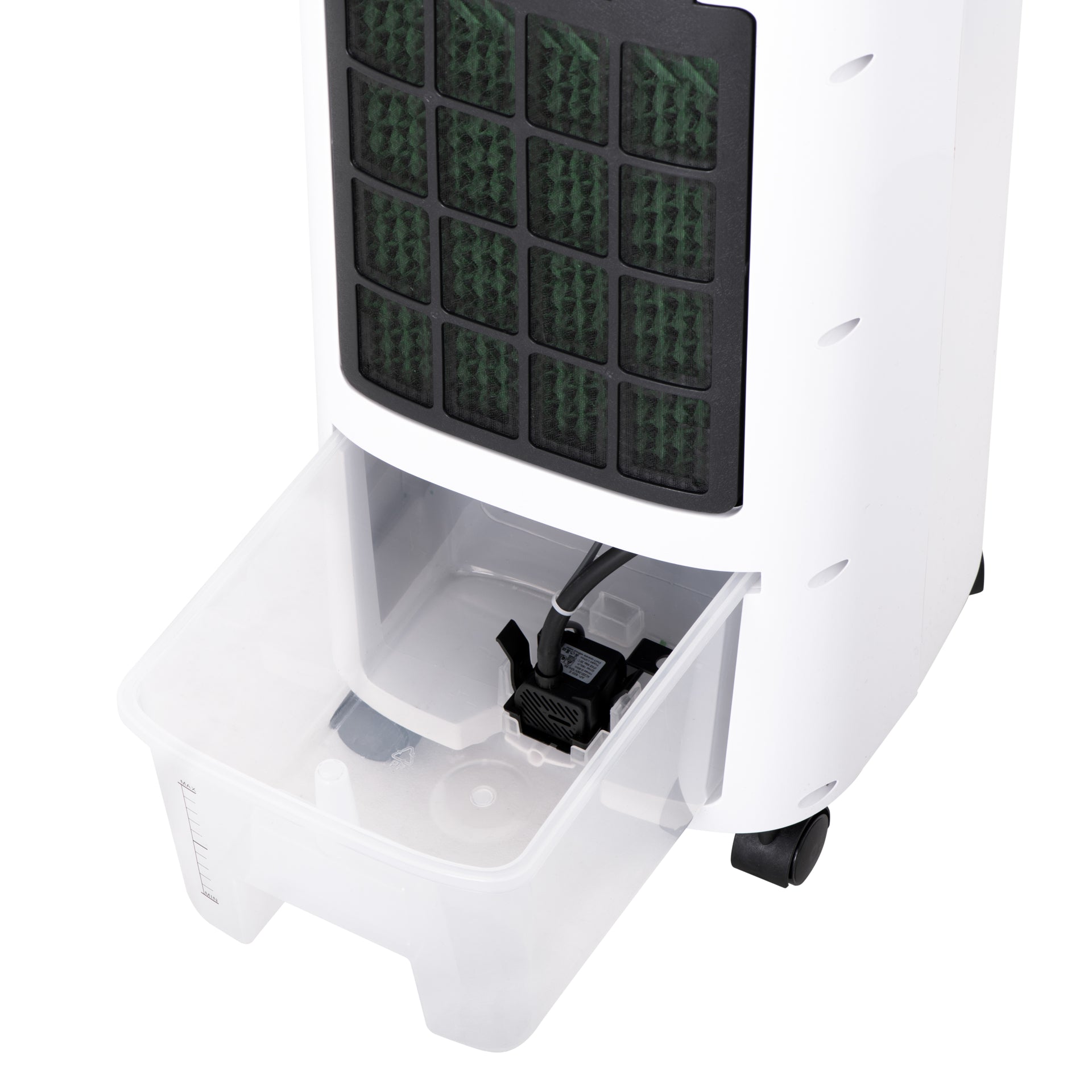 Dispozitivul nu numai ca arata elegant, dar permite si ajustarea setarilor la nevoile individuale ale utilizatorului. Panoul tactil LED face ca reglarea racitorului de aer si controlul acestuia sa fie foarte intuitive. Telecomanda va permite sa reglati setarile de la distanta. Si caracteristica de oscilatie orizontala distribuie aerul in valuri, mai degraba decat sa se concentreze pe un singur punct. Trei moduri de ventilator includ functionarea pe timp de noapte, ceea ce este foarte util, deoarece aparatul de aer conditionat nu face mult zgomot de lucru, iar noptile de vara pot fi infundate si fierbinti. Functia COOL scade temperatura prin activarea pompei de apa. In aparat sunt doua recipiente de congelare, iar producatorul a specificat consumul de apa la 500 ml/ora. Indicatorul de nivel al apei previne supraumplerea rezervorului.