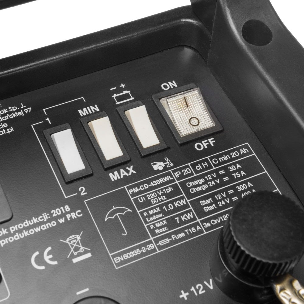 Incarcator automat si precis de baterie de inalta calitate, cu demaror POWERMAT PM-CD-430RWL. Functioneaza excelent in servicii de masini si ateliere profesionale, precum si in garaje de acasa. Dispozitivul se poate incarca cu 12V si 24V. Are functia de pornire a motoarelor pe benzina si diesel. Functia de incarcare rapida va permite sa cresteti curentul, datorita caruia bateria va fi incarcata mult mai rapid, in special cu baterii cu capacitate mai mare. Ampermetrul incorporat instalat in dispozitiv indica nivelul de incarcare a bateriei si puterea consumata in momentul pornirii vehiculului. Puterea mare permite utilizarea versatila a redresorului. Redresorul are un amplificator digital, doua conexiuni de curent PLUS 12v si PLUS 24v, o siguranta si un fir negativ montat permanent. Dispozitivul are o posibilitate mare de configurare a volumului de incarcare si a functiei de pornire. Curentul de incarcare poate fi configurat de la cel mai mic la cel mai mare: 1 + Min; 1 + max; 2 + min si 2 + max. Cu optiunea de pornire, redresorul poate fi utilizat o singura data pentru 5 rotatii ale motorului sau maxim 120 de secunde. Cand incarcati o baterie cu un dispozitiv atat de puternic, amintiti-va ca amperajul indica o putere de cel mult 10% din capacitatea bateriei, de exemplu: curent de incarcare 20 Ah max 2A, 100 Ah curent maxim de incarcare 10A. Ecranul LED mare informeaza utilizatorul despre fluxul curent de energie. Datorita acestui fapt, putem adapta cu exactitate si usor setarile curente la bateria incarcata. In plus, echipamentul este echipat cu conexiuni de alimentare solide si o siguranta usor accesibila. Dispozitivele au o adancime in care cablurile sunt ascunse in timpul transportului sau depozitarii si un suport pentru cabluri proeminente. Incarcatoarele Powermat de la sunt echipate cu roti mari si solide, ceea ce faciliteaza transportul dispozitivului.