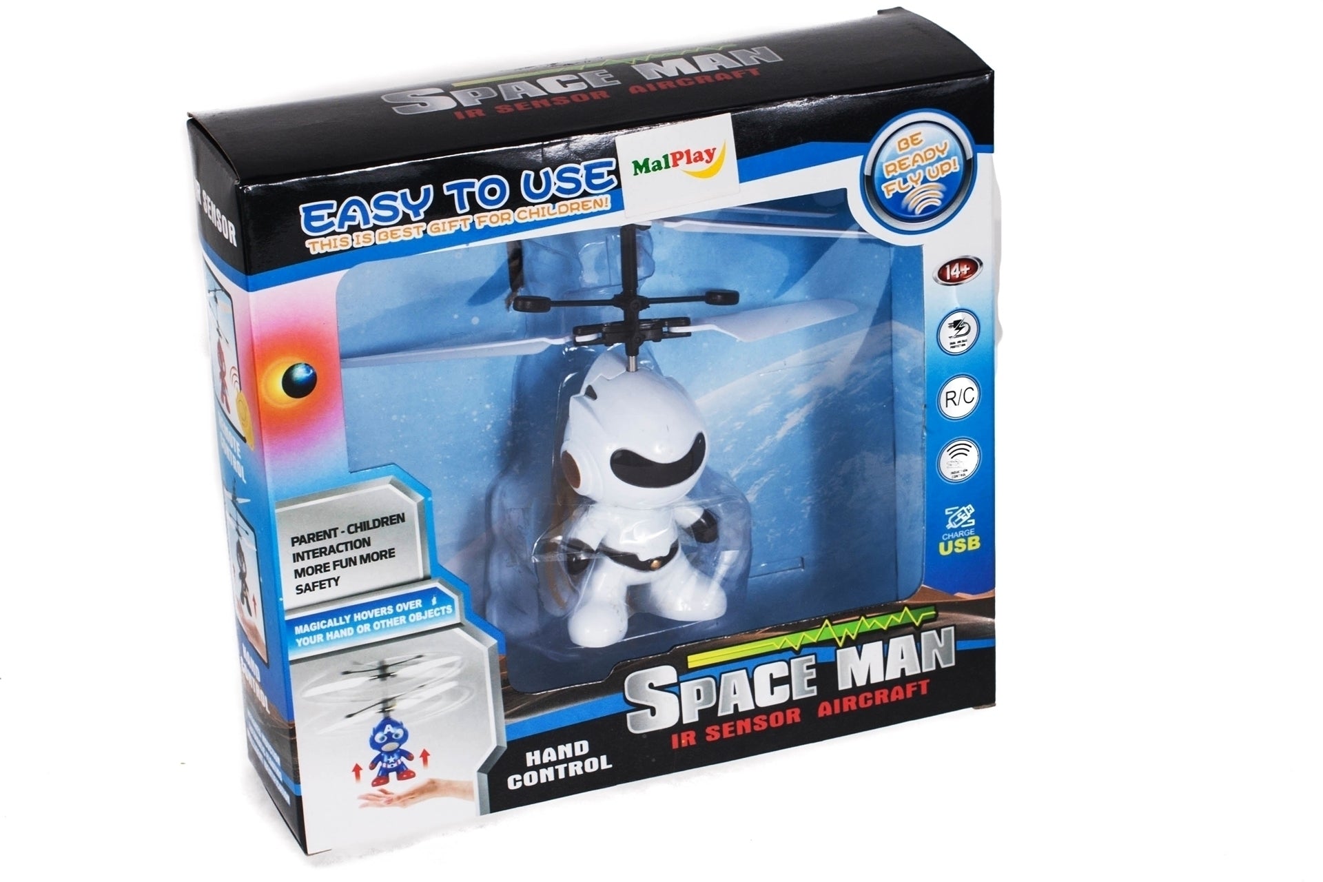 Robotel zburator actionat manual, prin ridicarea usoara in aer, cu ajutorul unui senzor de proximitate aflat in talpile acestuia.