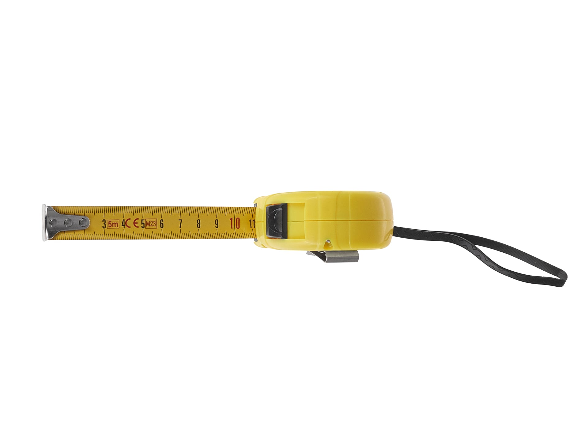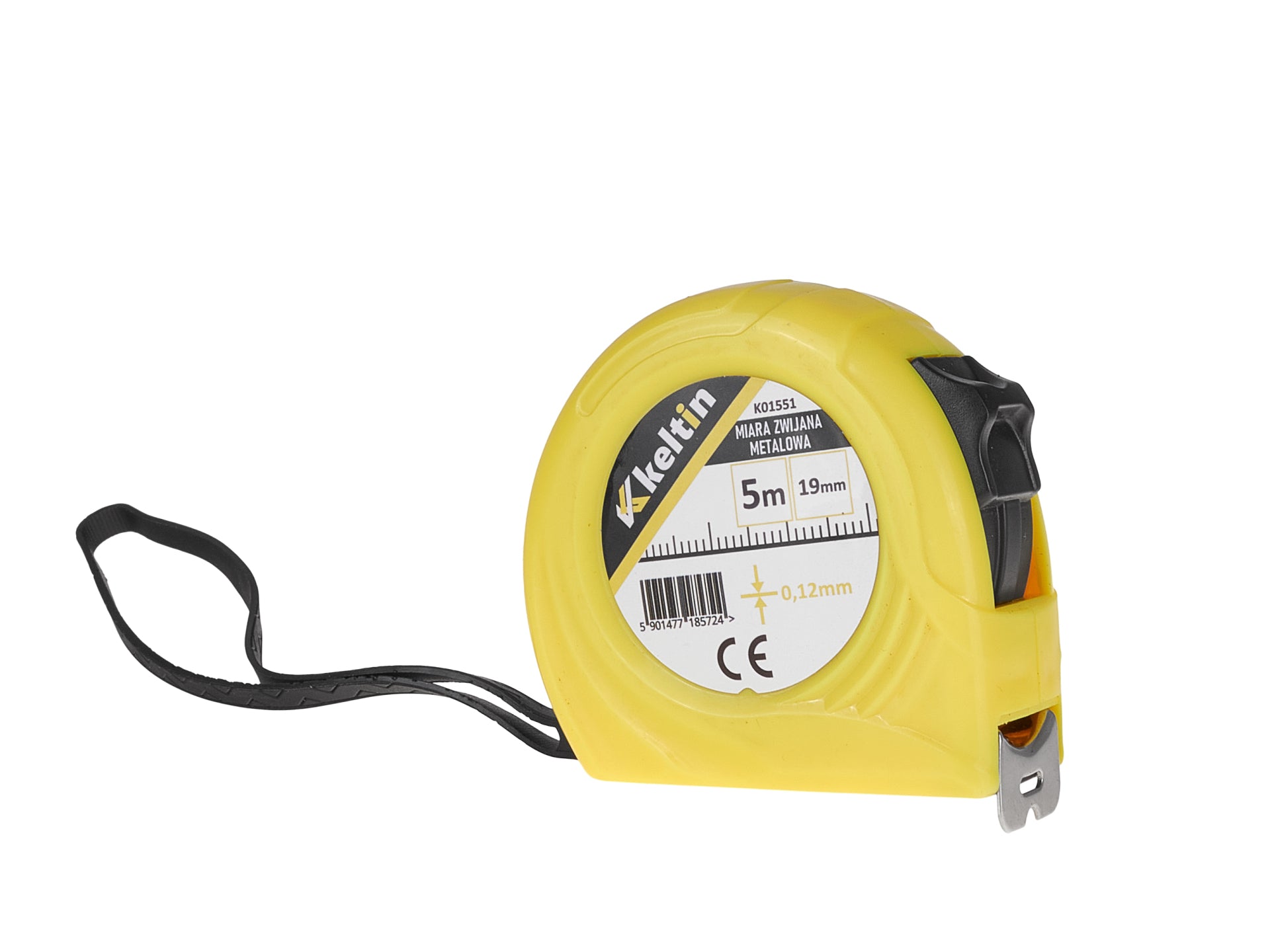 Ruleta de masurare, banda de otel laminata cu incuietoare. Banda are 5 m lungime, 19 mm latime si 0,12 mm grosime.