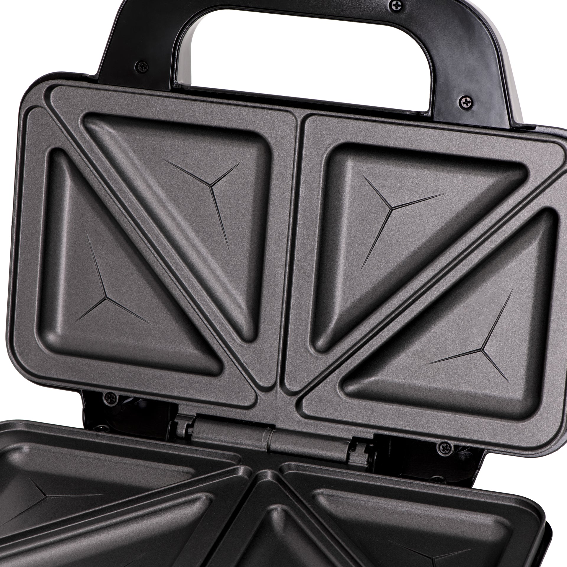 In partea de sus a capacului, exista un indicator de putere si un indicator luminos de termostat, care semnaleaza disponibilitatea pentru prajire si atingerea temperaturii potrivite. Termostatul mentine temperatura potrivita pe farfurii, astfel incat sa putem pregati sandvisuri crocante si aurii. Pentru siguranta, o clema de inchidere este plasata pe manerul care nu se incalzeste. Impiedica deschiderea de la sine a capacului in timpul lucrului. In doar 5-15 minute te poti bucura de paine prajita fierbinte cu ingredientele tale preferate. De asemenea, curatarea dispozitivului nu necesita niciun efort din partea noastra. Tot ce trebuie sa faceti este sa asteptati sa se raceasca aparatul, apoi sa colectati reziduurile ramase pe farfurii cu o carpa umeda si sa stergeti suprafata de incalzire cu un prosop de hartie.