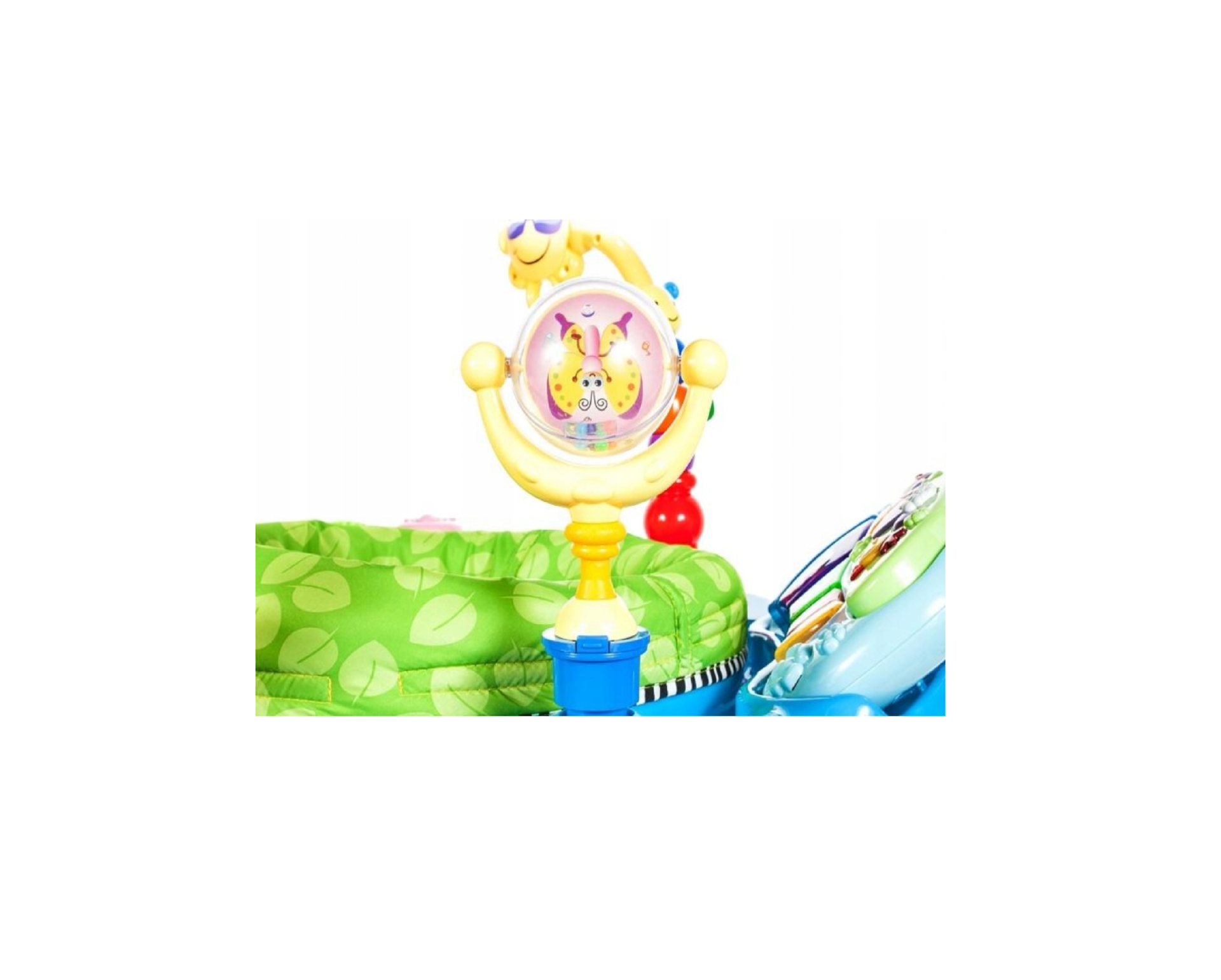 Scaunul confortabil este inconjurat de jucarii colorate pe arcade, un pian si zornaite. Trei picioare impiedica in mod eficient rasturnarea scaunului.