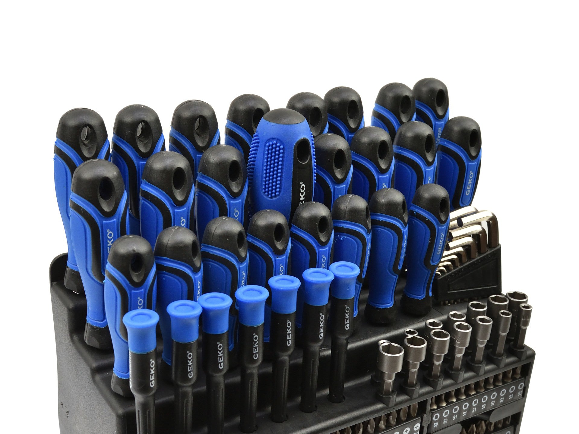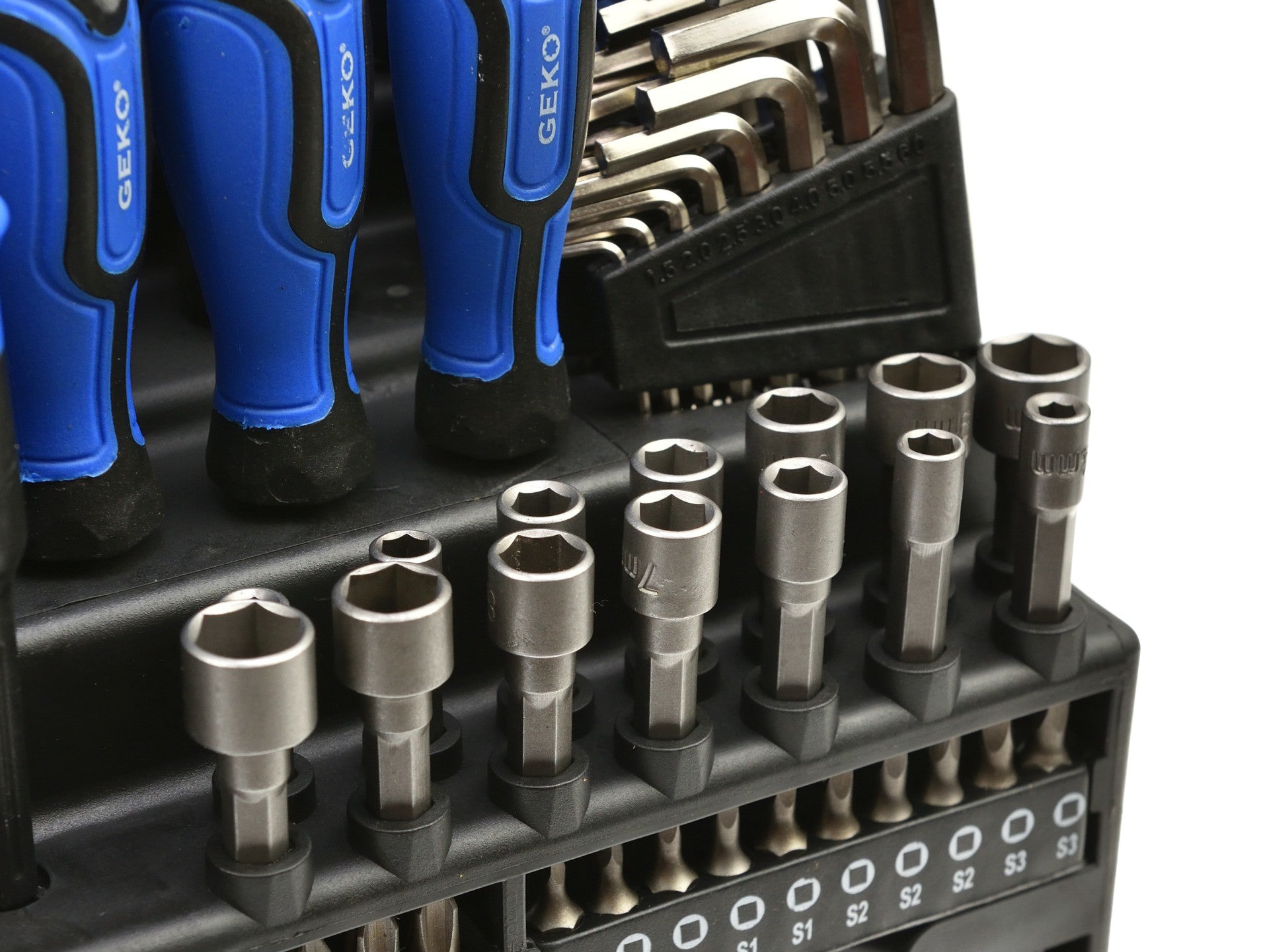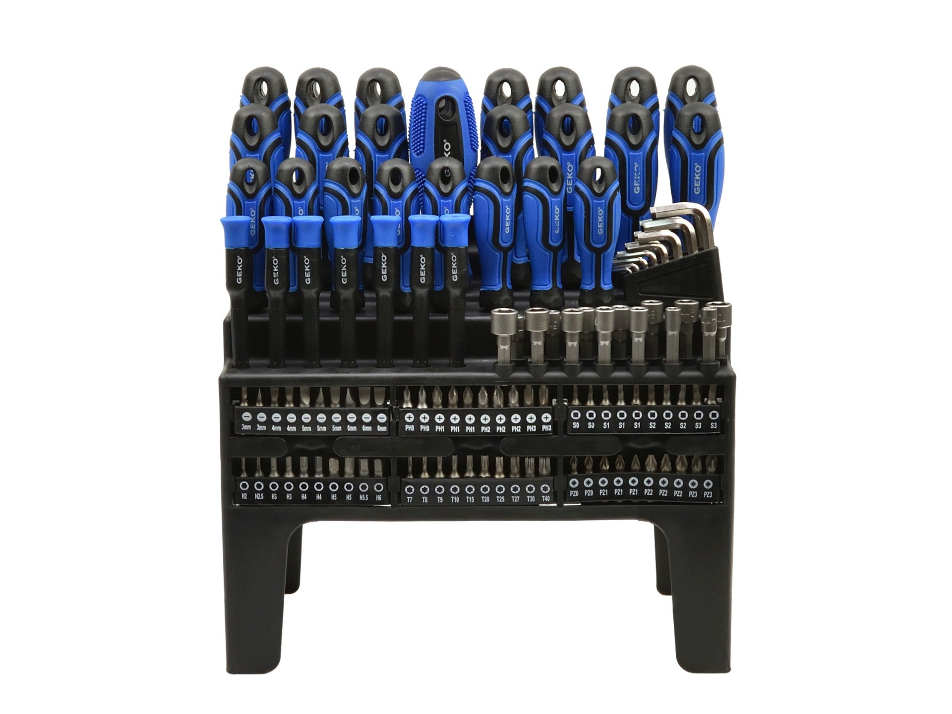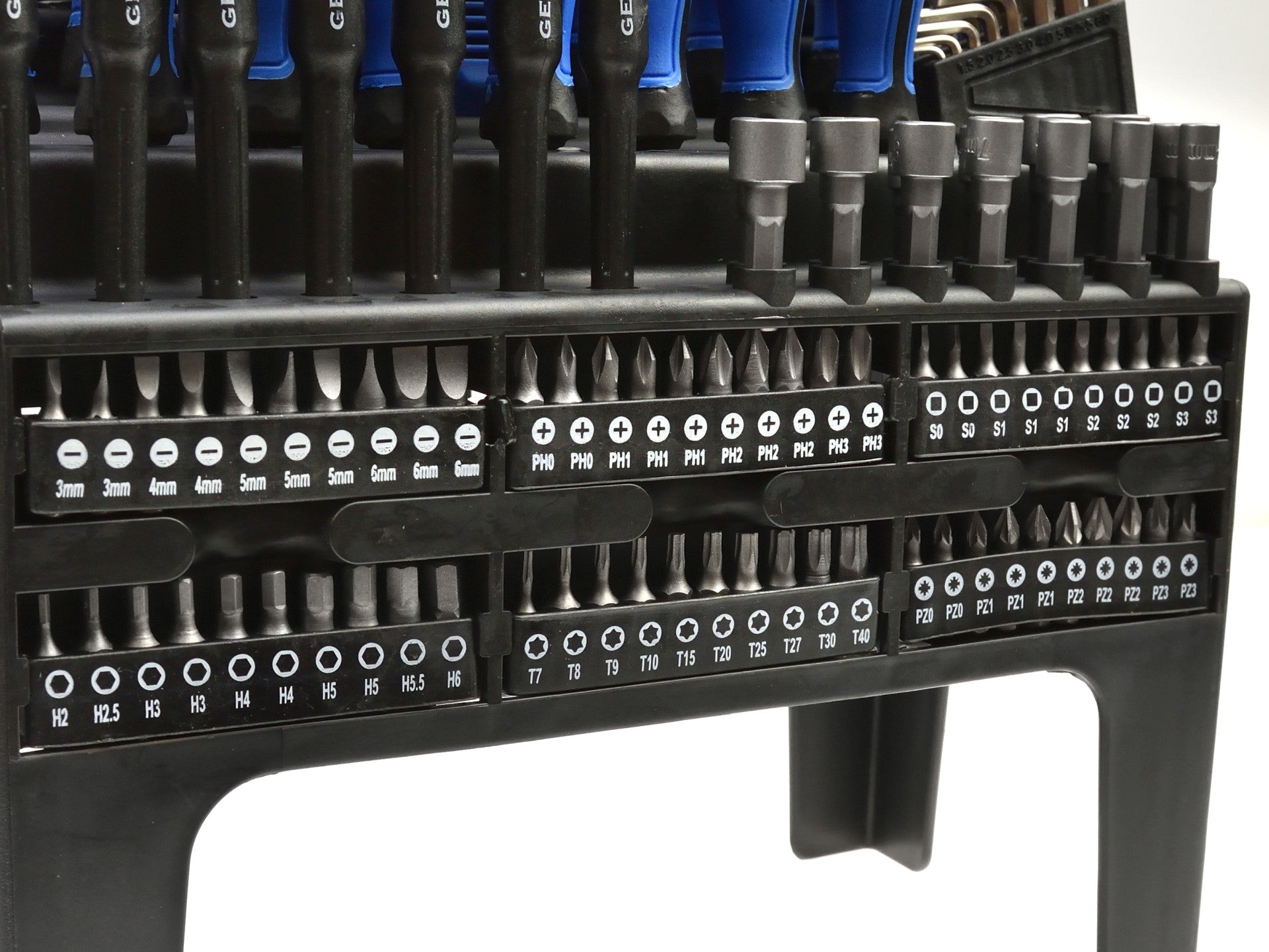 Set de 122 de bucati de surubelnite, biti si prize pe un suport.