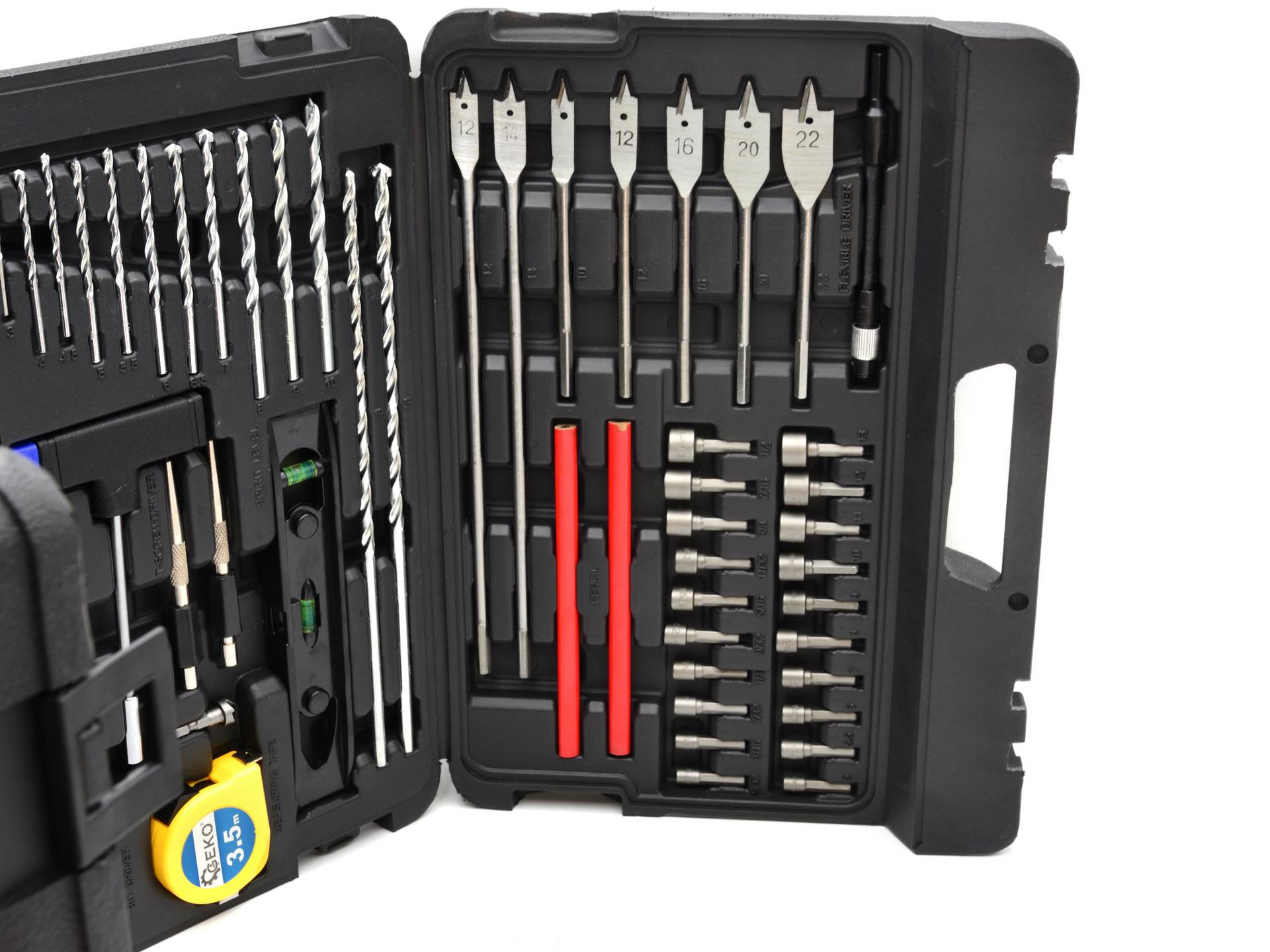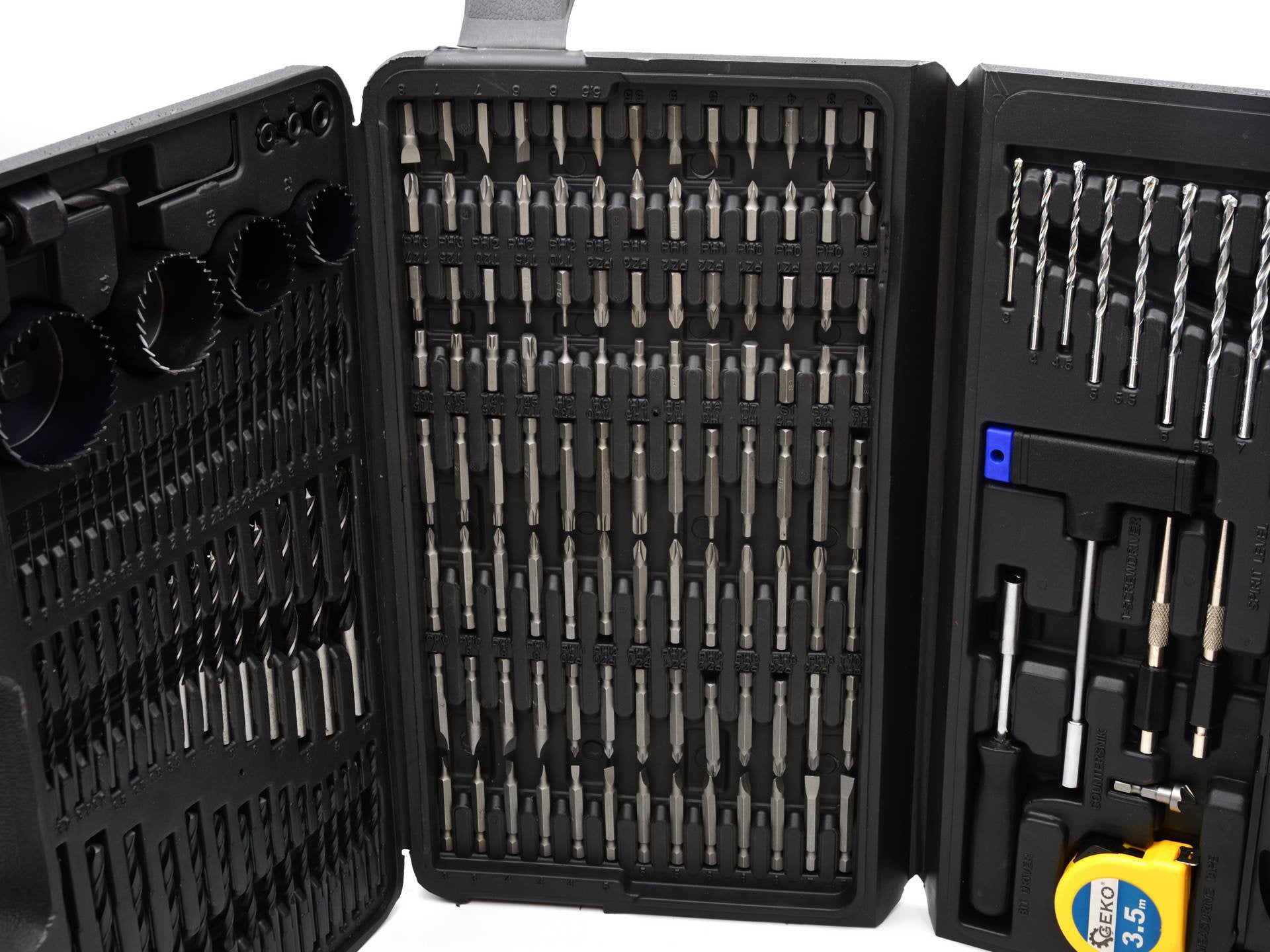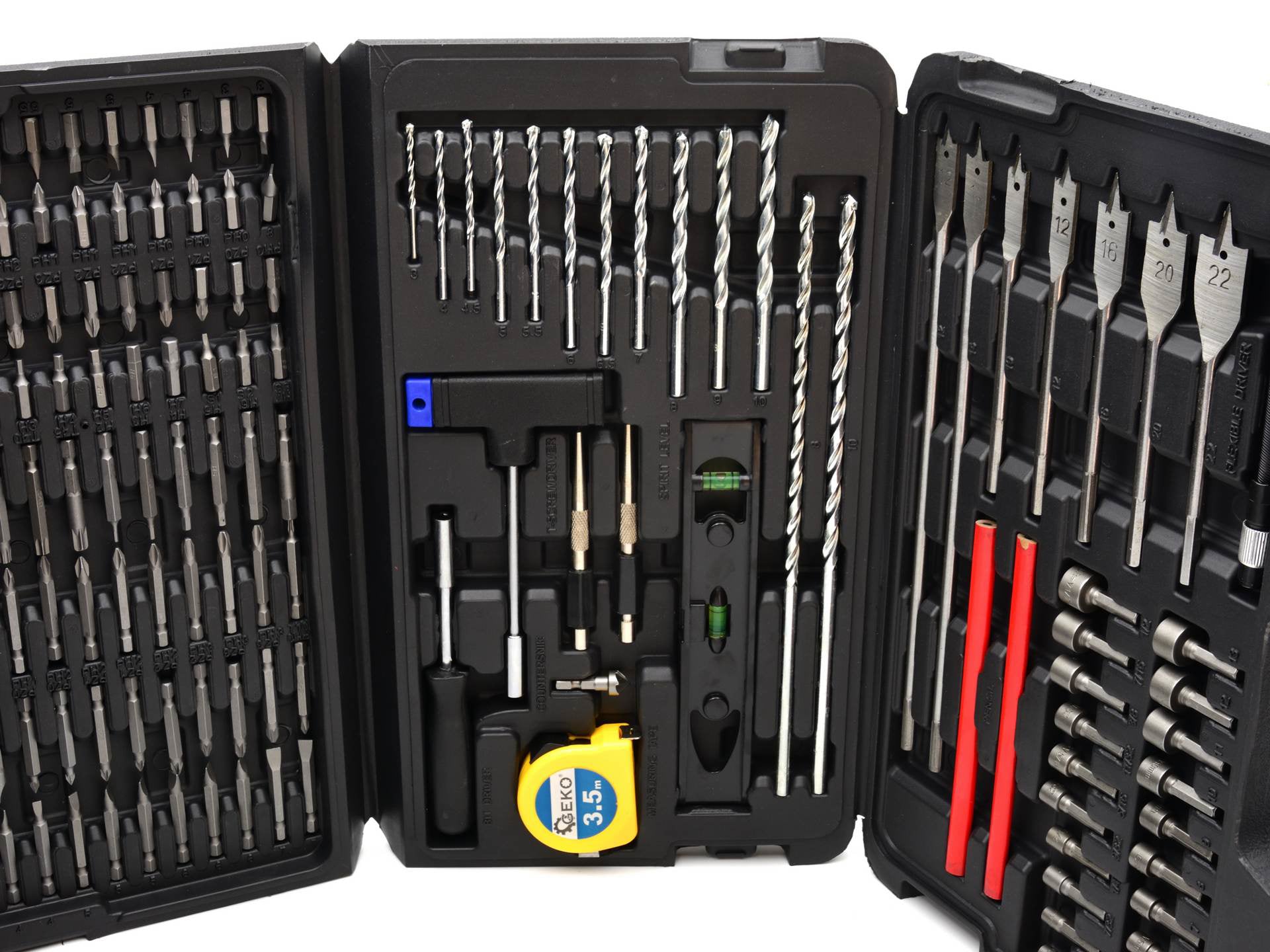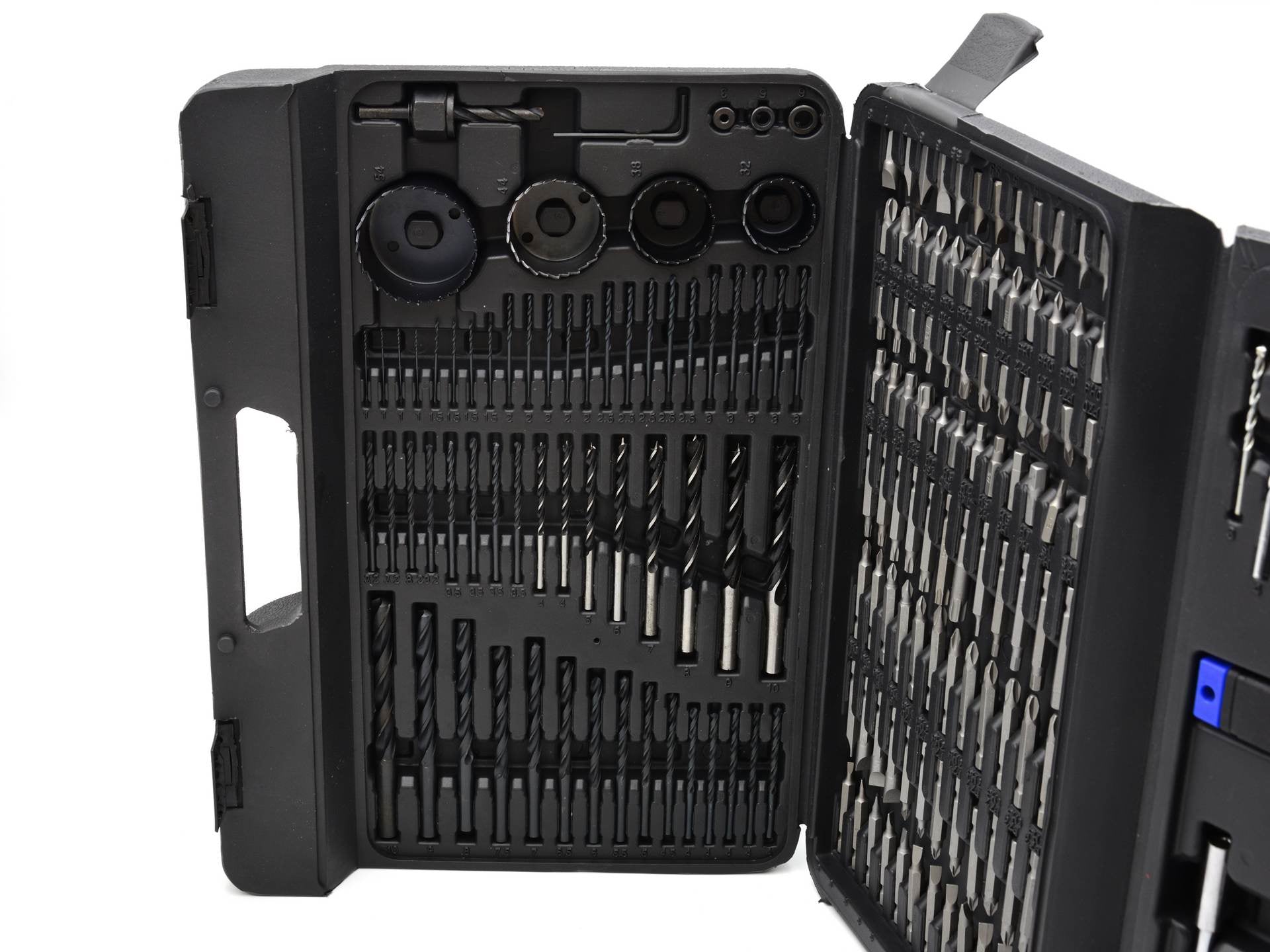 Set universal de accesorii. Perfect pentru pasionatii de bricolaj. Contine peste 100 de surubelnite, peste 70 de burghie si un sortiment de unelte manuale.