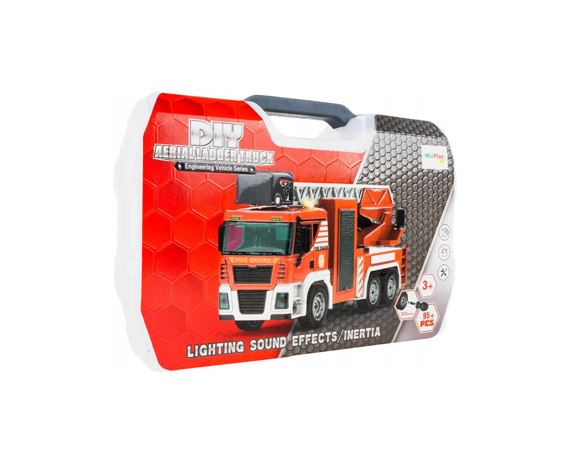 Setul include toate elementele necesare asamblarii vehiculului si diverse indicatoare rutiere. Departamentul de pompieri emite sunetele de pornire a vehiculului, mers inapoi si claxonul, care este insotit de lampi rosii in partea de sus a cabinei.