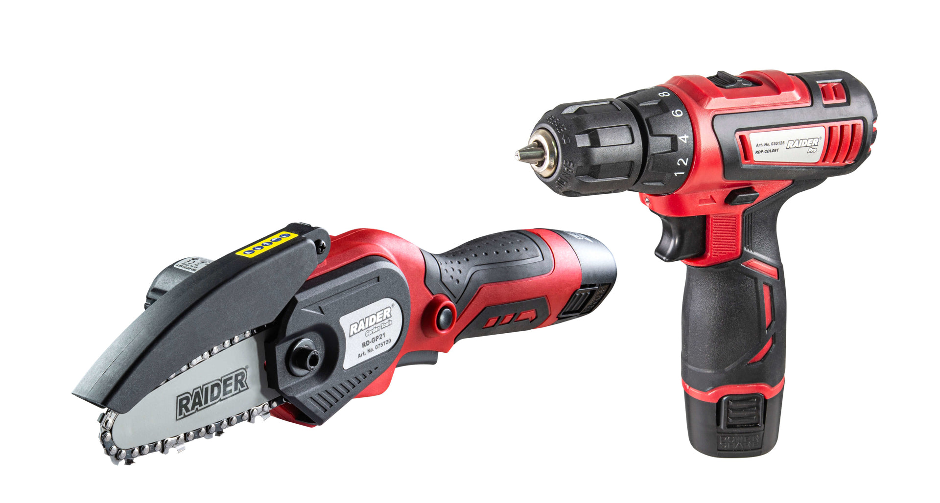 Raider Pro prezinta un set combinat „RDP-CDLGP02” care contine 2 unelte – un ferastrau fara fir si un burghiu cu acumulator. Setul are doua baterii cu o capacitate de 2 Ah, precum si un incarcator de 12V potrivit pentru acestea.