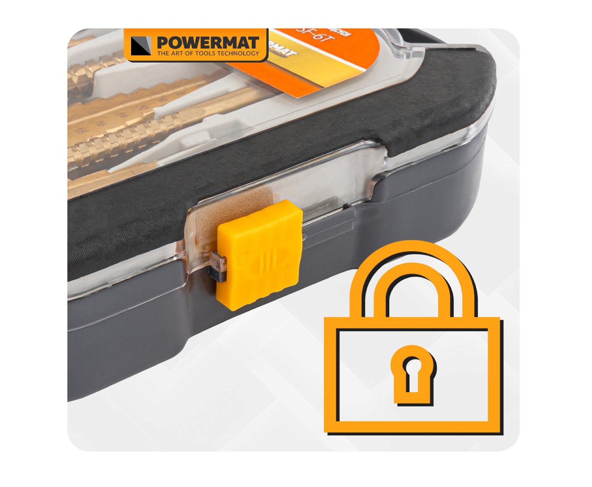 Cutia este echipata cu un mecanism de inchidere care protejeaza burghiele impotriva caderii si a deteriorarii accidentale.