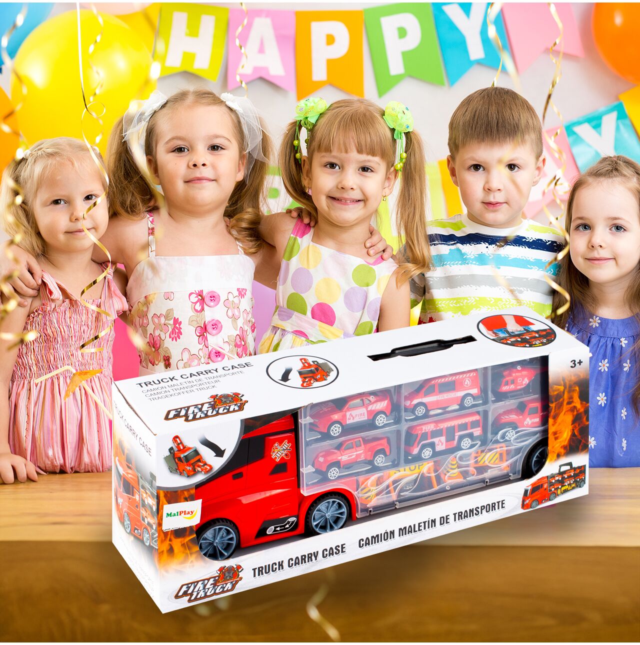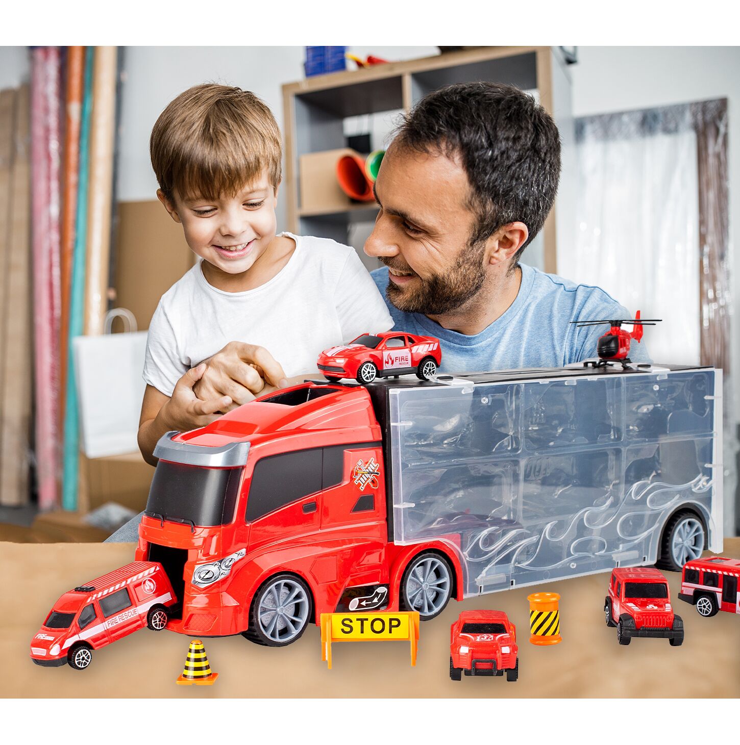 CAMION PLATFORMA CU MASINI DE POMPIERI – DISTRACTIE GARANTATA PENTRU MICII EROI!